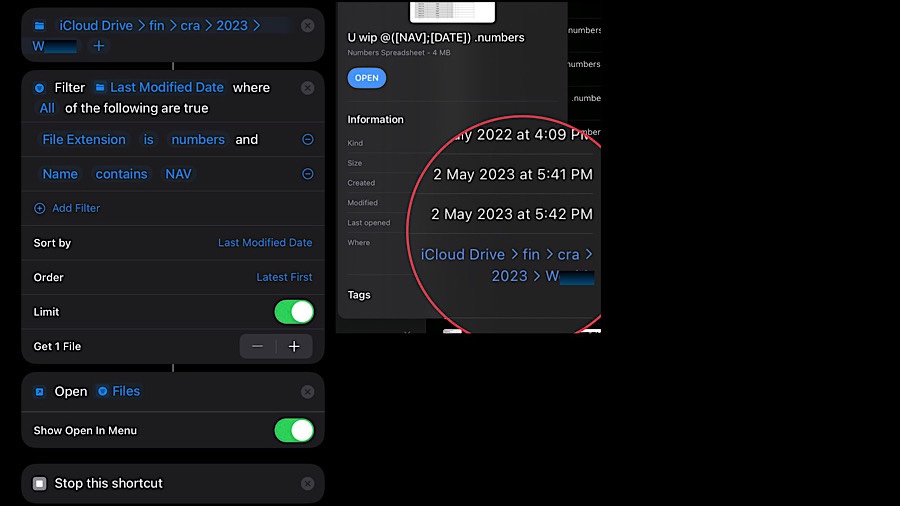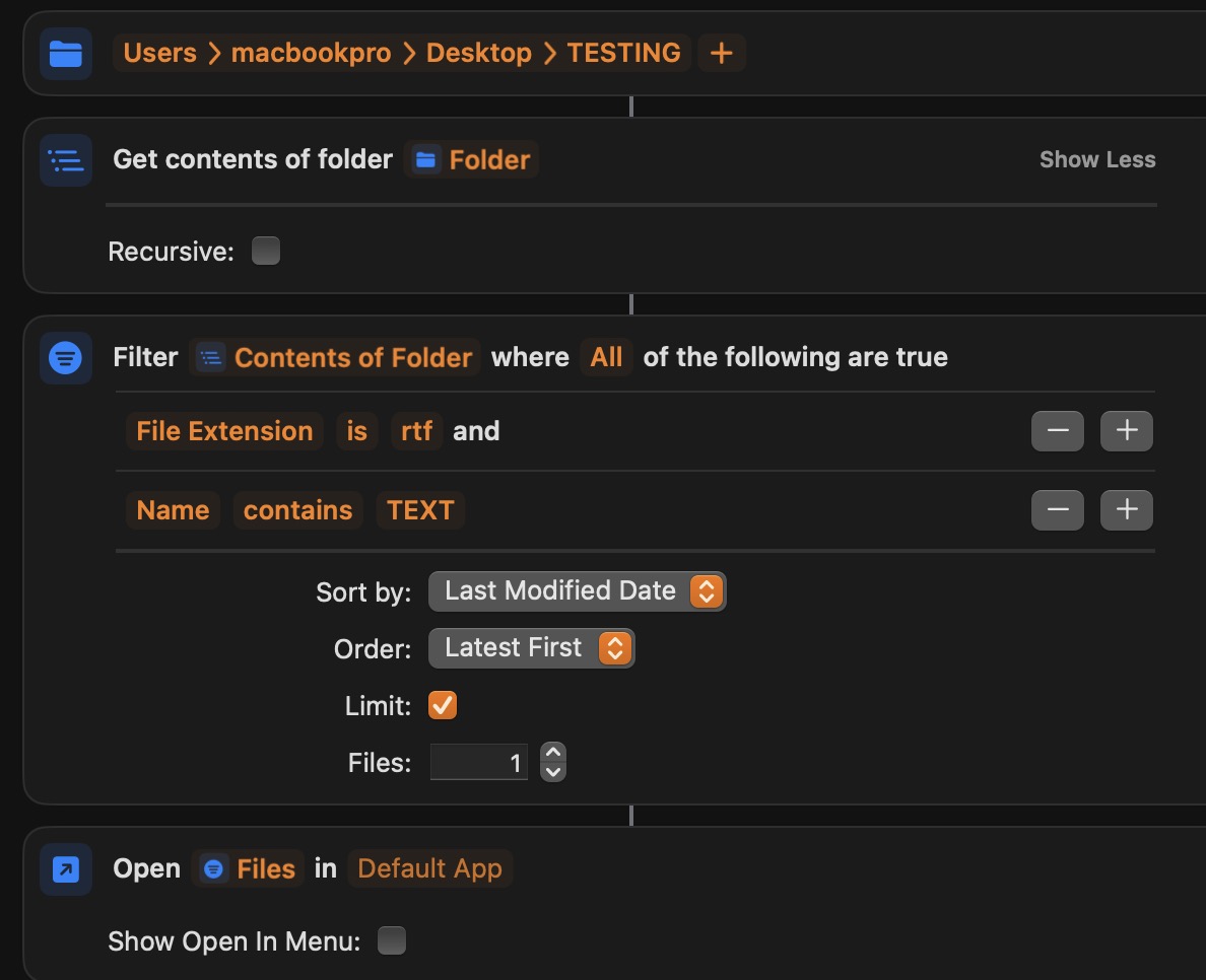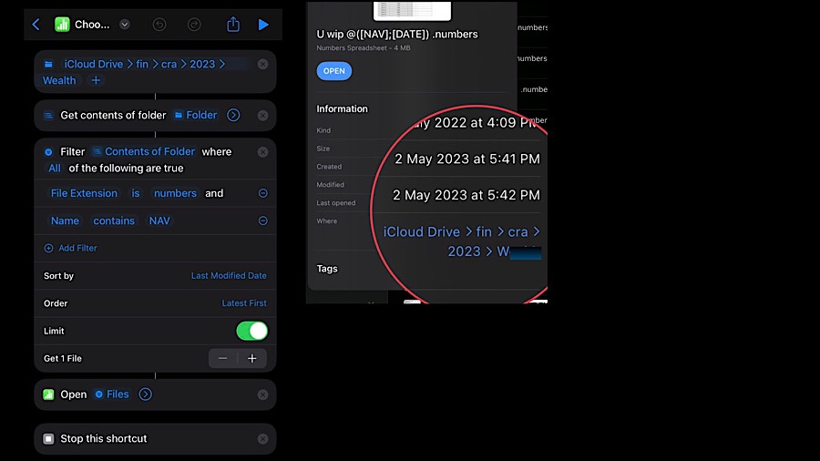 How to build shortcut to open the last modified Numbers file saved in a folder