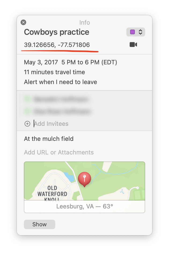 Apple, please add the ability to enter coordinates (like 40.780467, -73.966106) for an event location back to Calendar. Many years ago iCal had this capability. This would be very useful for setting up shared events and defining a precise meeting point.