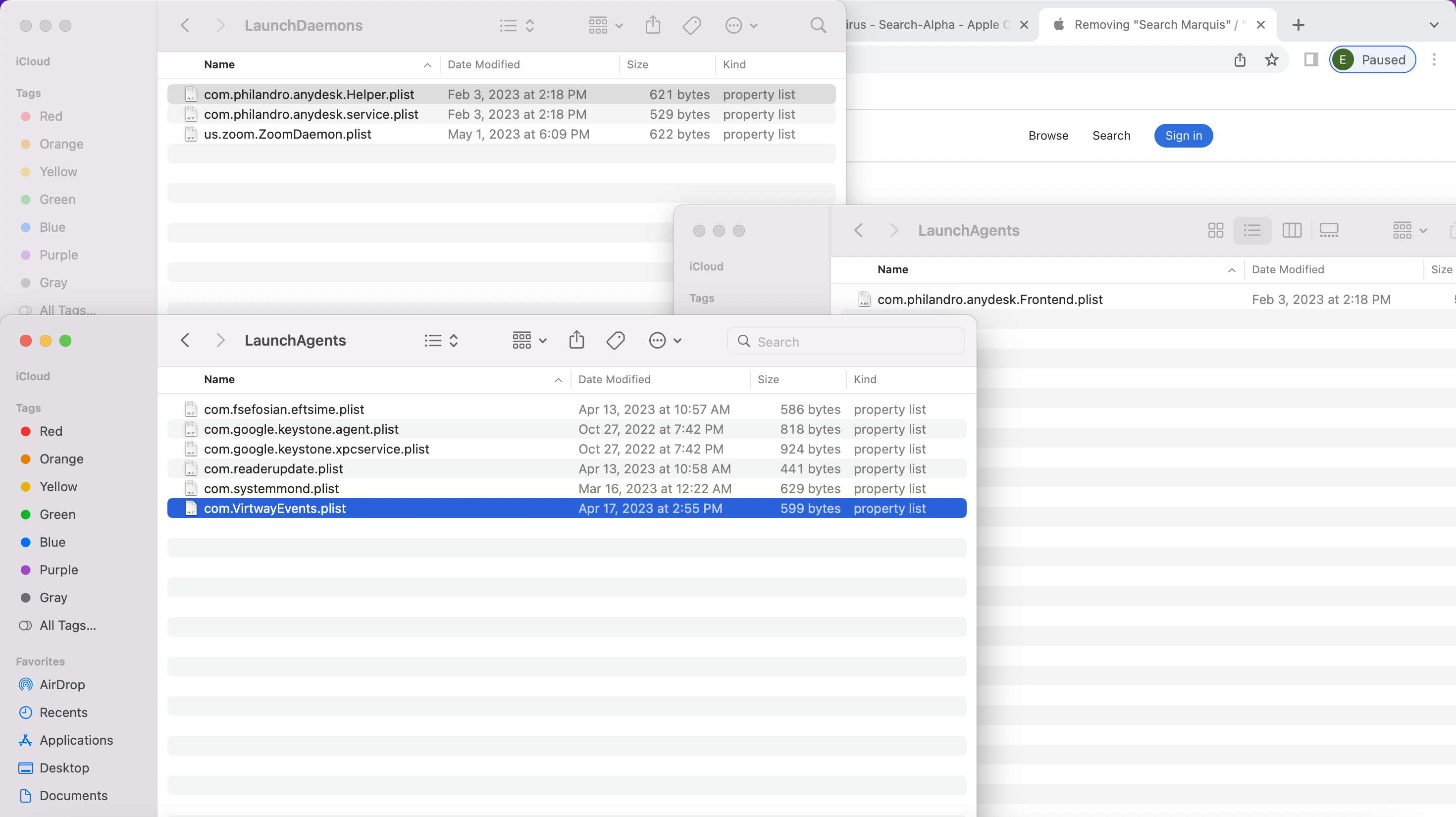 Next: This step will prevent the scam products from loading so that they can be removed while they are inactive. Restart in "Safe Mode", and log in: How to use safe mode on your Mac - Apple Support. Starting in Safe Mode takes longer than usual so let it finish. The rogue processes affecting that Mac are inoperative in "Safe Mode".