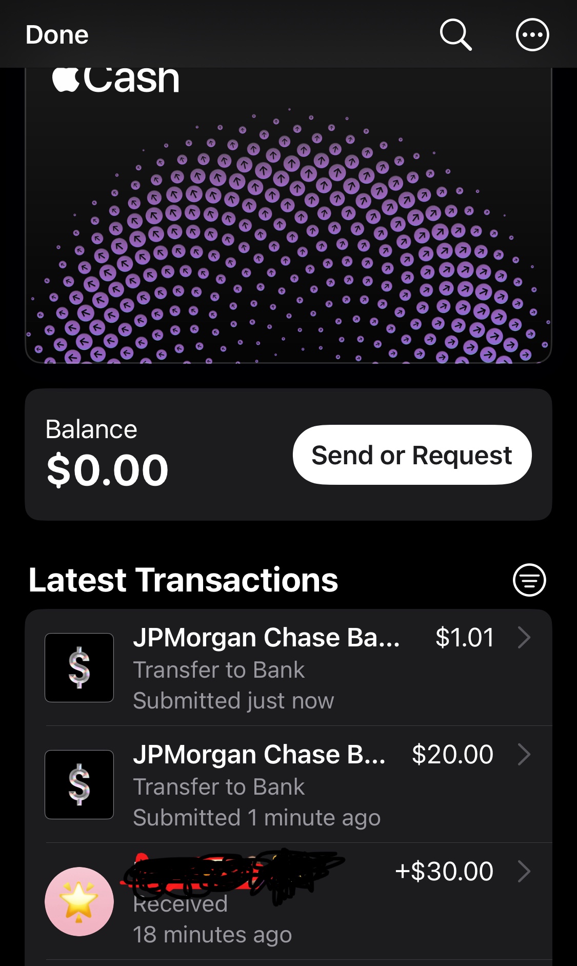 My sister sent me exactly $30 to my Apple Cash balance through Apple Pay (iMessage). Afterward, I tried to transfer the cash to my bank, but at first, it wouldn't let me send all the money at once to my bank, which was very strange. I tried sending a lower amount ($20) and it worked. Even more strange, $8.99 completely disappeared from my balance and I only had $1.01 left, so I just transferred the remaining.