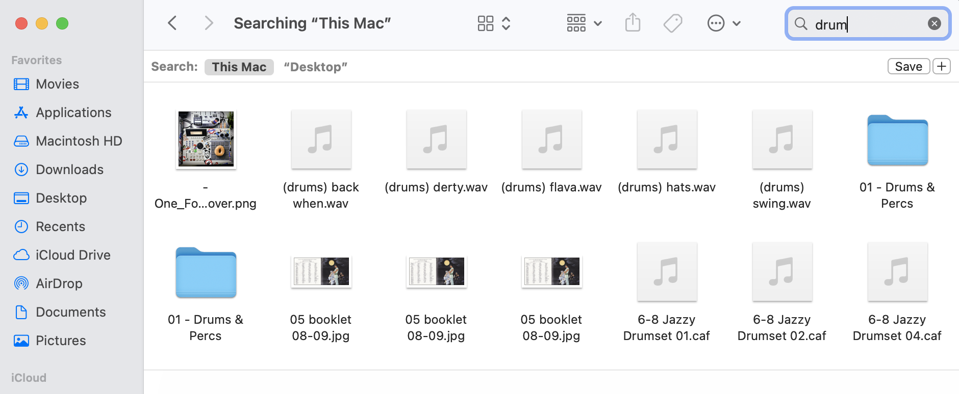 Secondly, just entering the string "drum" to Spotlight is requesting it to check every selected Result category including text inside documents. Better to use the case-insensitive name reserved word that only deals with files.