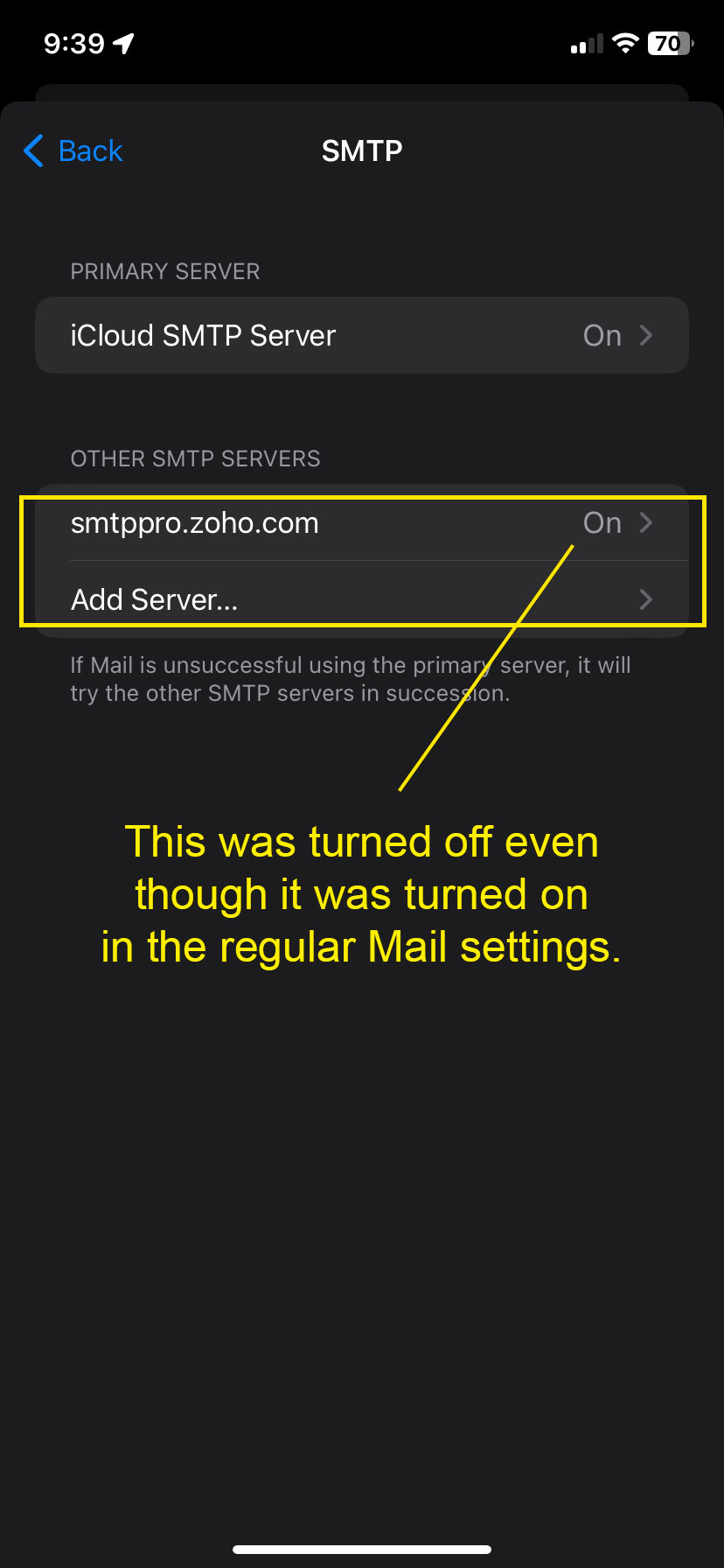 I went to the iCloud Mail settings on my iPhone and scrolled to the bottom, where I found the "OUTGOING MAIL SERVER" SMTP iCloud SMTP Server. Not only was the iCloud SMTP Server in there, but to my surprise, so was the Zoho SMTP server for my custom email domain – and it was turned off! After turning it on, everything was back to normal and my custom domain emails started sending again.