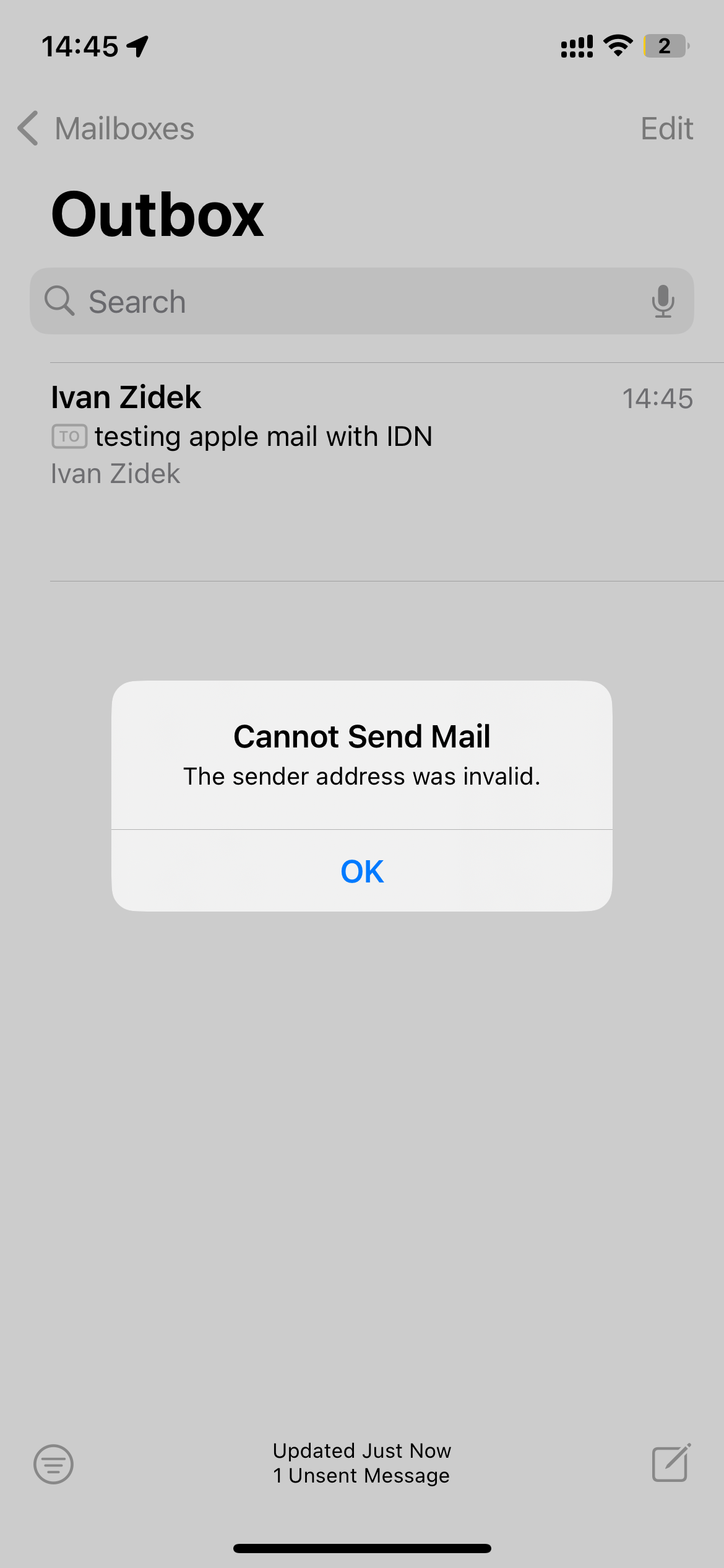 Looks like even the latest iOS 17.1.2 mail app cannot handle IDNs properly.