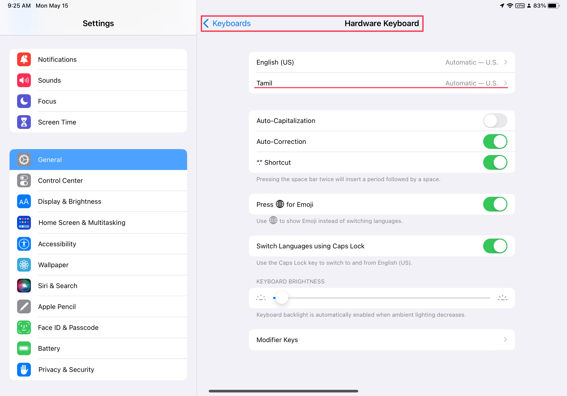 I am unable to type with Tamil99 Keyboard in Magic Keyboard in an iPad Pro. I have enabled Tamil99 keyboard in Settings - Keyboards. But when I type in the hardware Magic Keyboard after selecting Tamil as the language option it is getting typed only in Anjal keyboard layout.