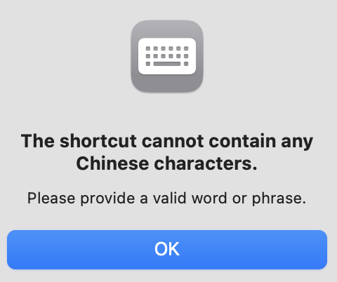 I use Japanese (Romaji input) and English, and already have numerous J to J shortcuts set up and functioning, but now, when trying to set up a new one, I get an error message like this.