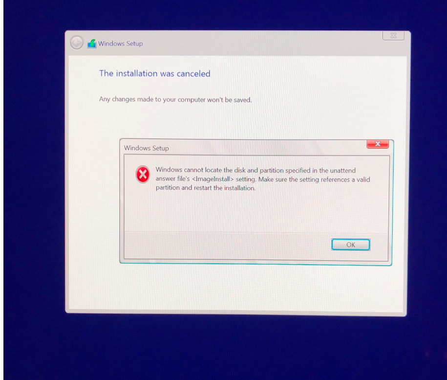 Notification: Windows cannot locate the disk and partition specified in the unattended answer file's < ImageInstall > setting. Make sure the setting references a valid partition and restart the installation.