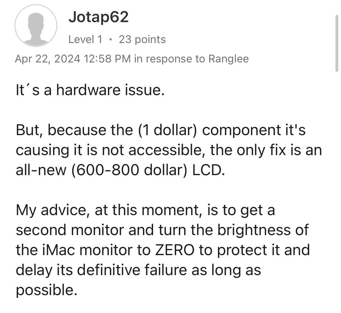 I tried to research teardown videos of the IMac 2021 and I think the author does have a point. The LCD screen was like screwed shut? It only has like 2 ports for the camera and screen itself from the outside. I haven’t seen a single video wherein they tried to open the screws from the LCD. So if you even want to know whats causing the problem, it’s impossible since it’s inaccessible.