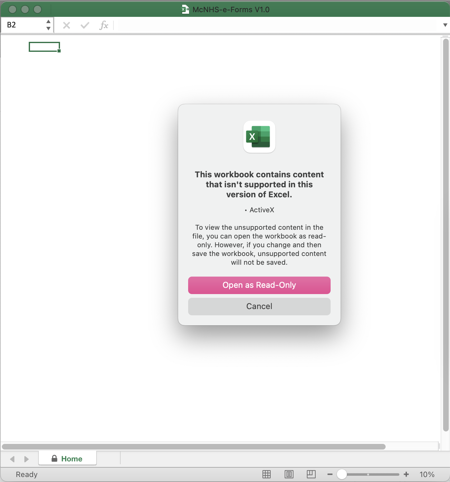 - I have several excel files with this extension and when I open them, a prompt appears saying "This workbook contains content that isn't supported in this version of Excel - ActiveX - open as read only or cancel". If I click cancel, the file will close/quit. If I click "open as read only", the file would stay open but I cannot edit or even click a cell/button in it.