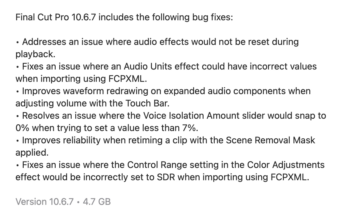 It's like things like Channel EQ and Limiter when applied in the prior version of FCPX got reset or stuck in 10.6.6.