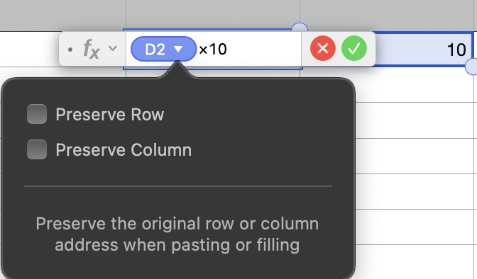 But now suppose that I want to expand the formula to include a constant value for all the cells in a column. Instead of cell B2 containing simply "$A2 + 3", suppose that I want to multiply the value in A2 by a constant stored in cell C22, and I want EVERY cell in column B to multiply its corresponding A-column value by the same constant in cell C22. For forty years, this was accomplished by entering the cell reference without the dollar sign. In other words, I would enter "($A2 x C22) + 3". Then I use the Table > Autofill Cells > Autofill Down and the cell in B3 contains the formula "($A3 x C22) + 3", and the cell in B4 contains the formula "($A4 x C22) + 3" and so on down the table.