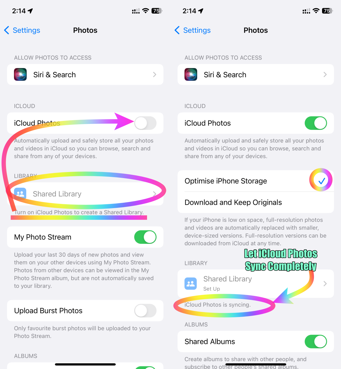 1) When you say "let icloud photos sync completely" does that mean that it's not until ALL the photos/videos on the Organizer's iphone (my husband) are synced that we can setup the "Shared Library?"