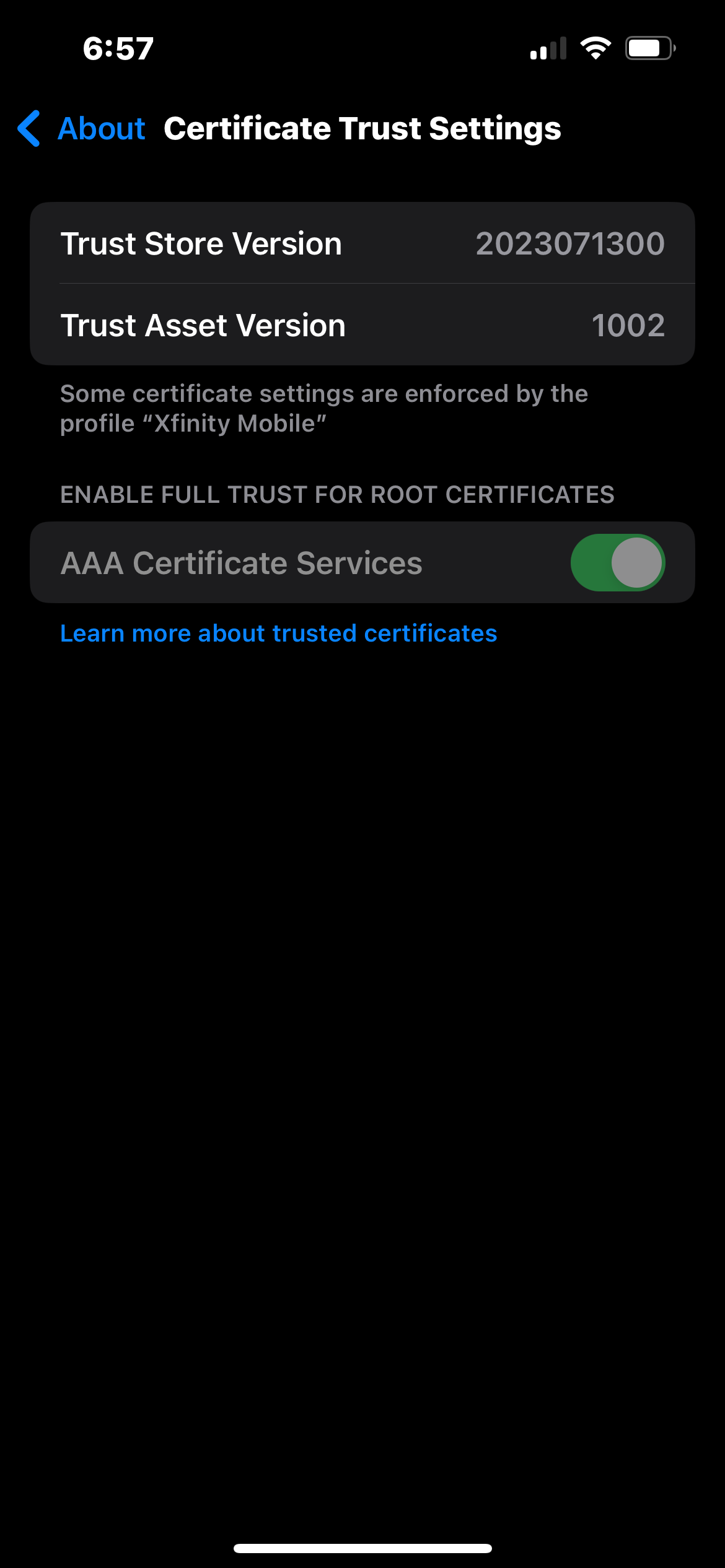 The root certificate is not from a Xfinity app. I don’t even have an Xfinity app. Are you for real? I know you know these things if you’re a level 10 whatever. This cert showing up in that place on the iPhone means iOS can’t validate the trust chain of the signing CA. Root certificates installed by either a MDM or on supervised devices disable the option to change the trust settings. Exactly my problem is I am unable to toggle off this certificate. (See my photos) My phone is totally hacked! Even you I’m talking to is probably part of the hack. Either that or you are just not wanting to see that this is a problem. My phone is not suppose to be supervised. Can you tell me why would it be supervised and by who? FML