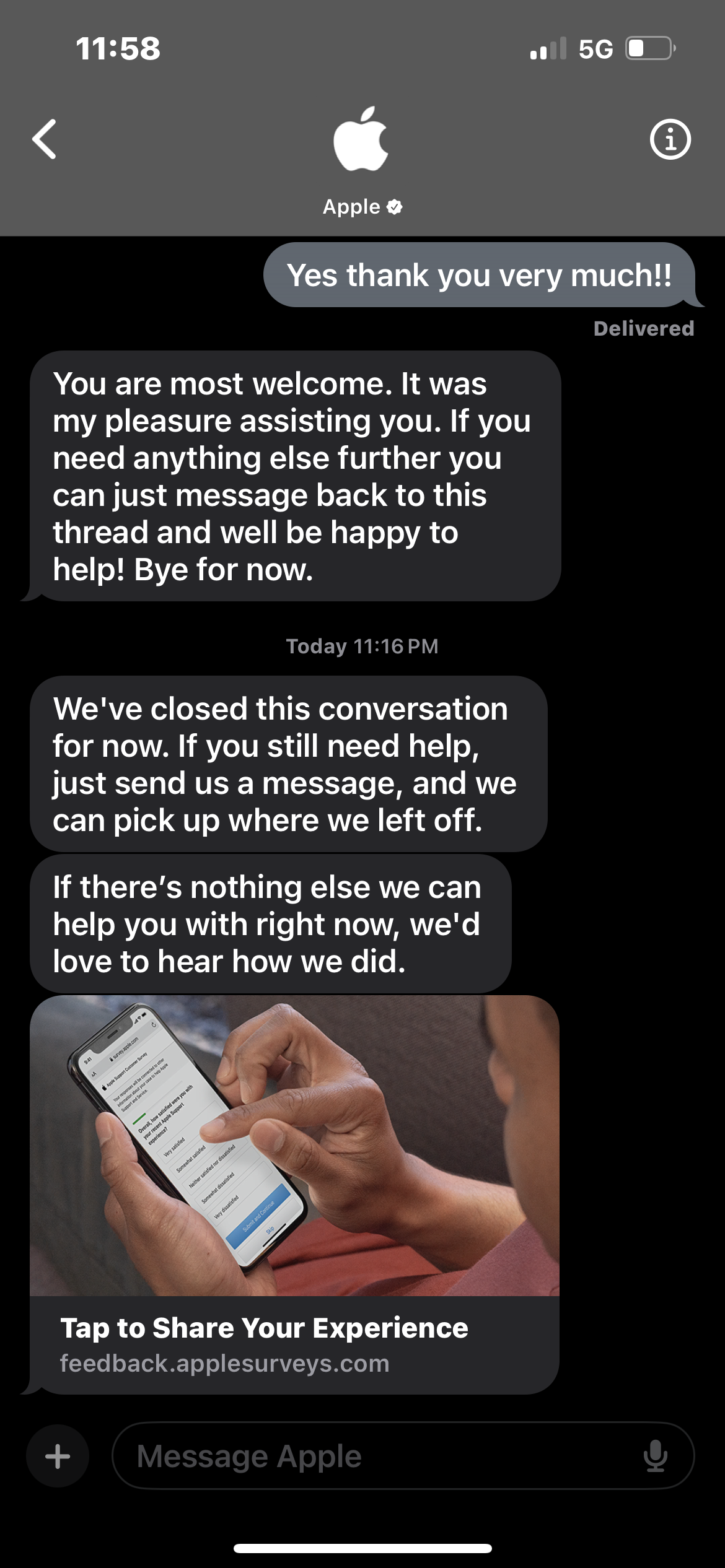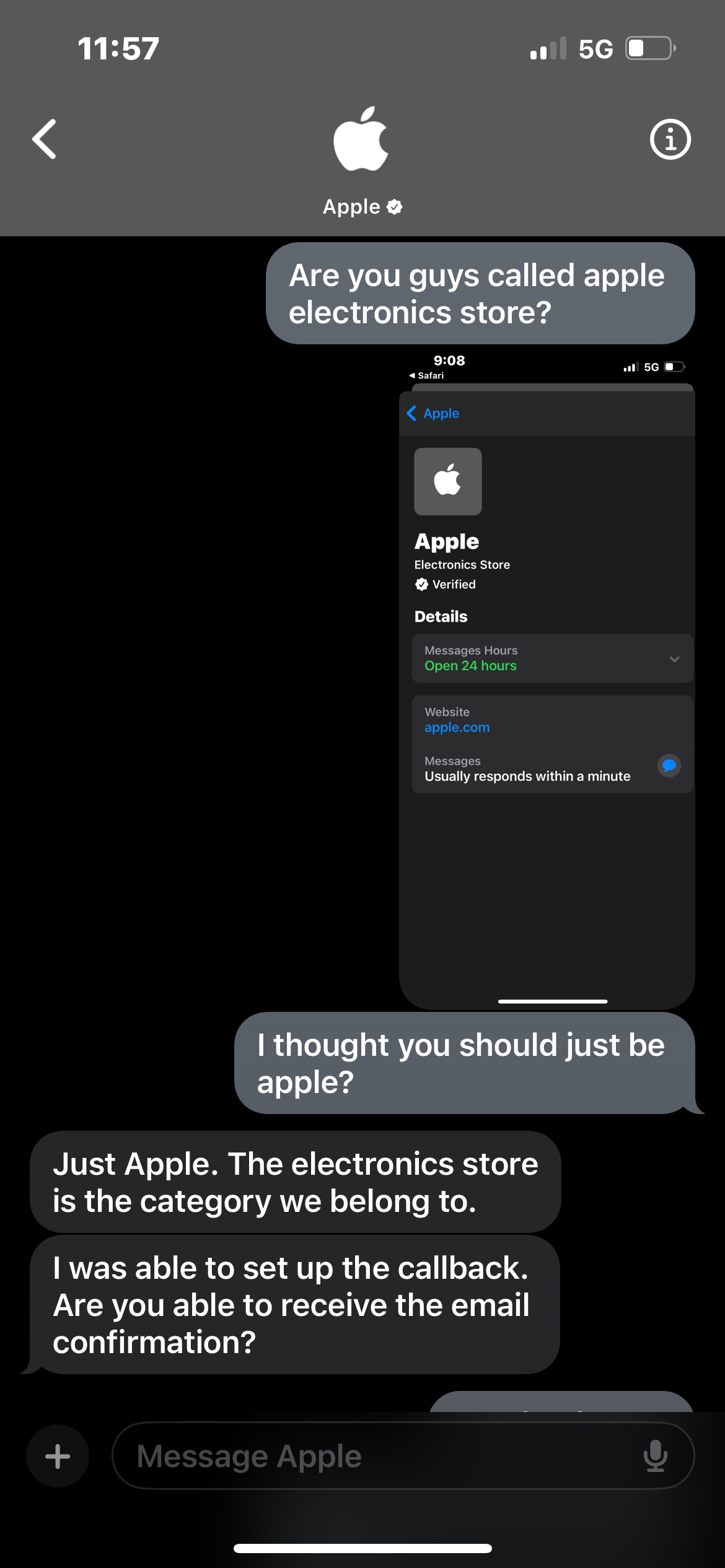 Oh new weird scary issue… I chatted on my message app with “Apple Support” today. When checking their icon in my messages it took me to the actual name of who I was speaking to. It read Apple Electronics Store lmao. When I asked the chat guy he said that it’s because the brand of apple is the electronics store omg! He went on to say more too. Then at the end of the chat I was invited to complete a survey and the address is feedback.applesurveys.com!! It’s not even an apple domain! So I’m pretty sure the hackers were chatting to me to get more info from me. Like my new phone number I had just gotten today hoping to fix this problem. I’ll have to get another new one now. But maybe you can verify if that is an apple website. From what I found it’s feedback. Apple.com. I’ll include photos as I thought it was pretty funny this guys explanation for why his apple impersonation was below the mediocre line at best.