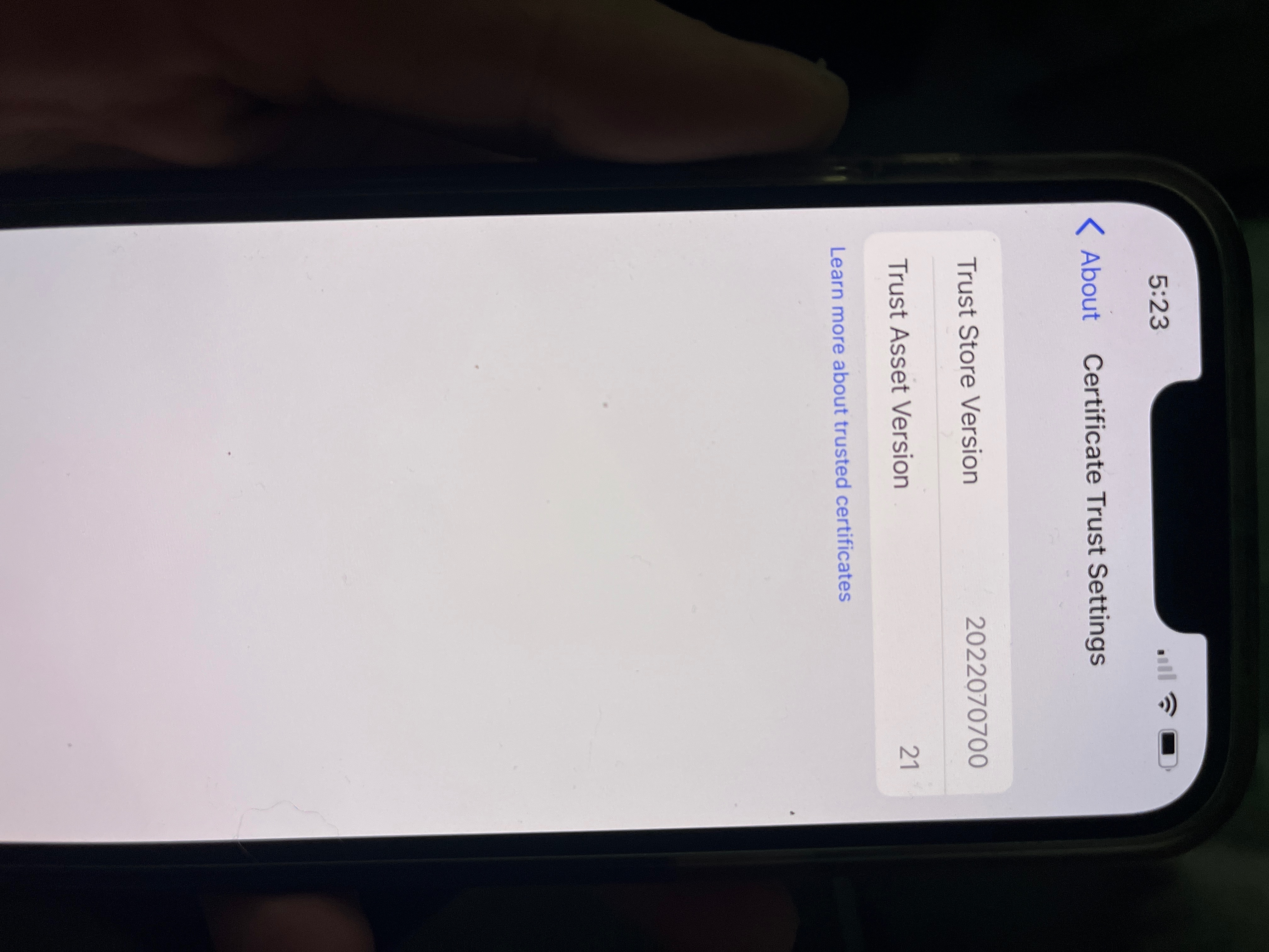 iPhone 13 Pro iOS 16.2 Trust Store Version: 2022070700 and Trust Asset Version 20