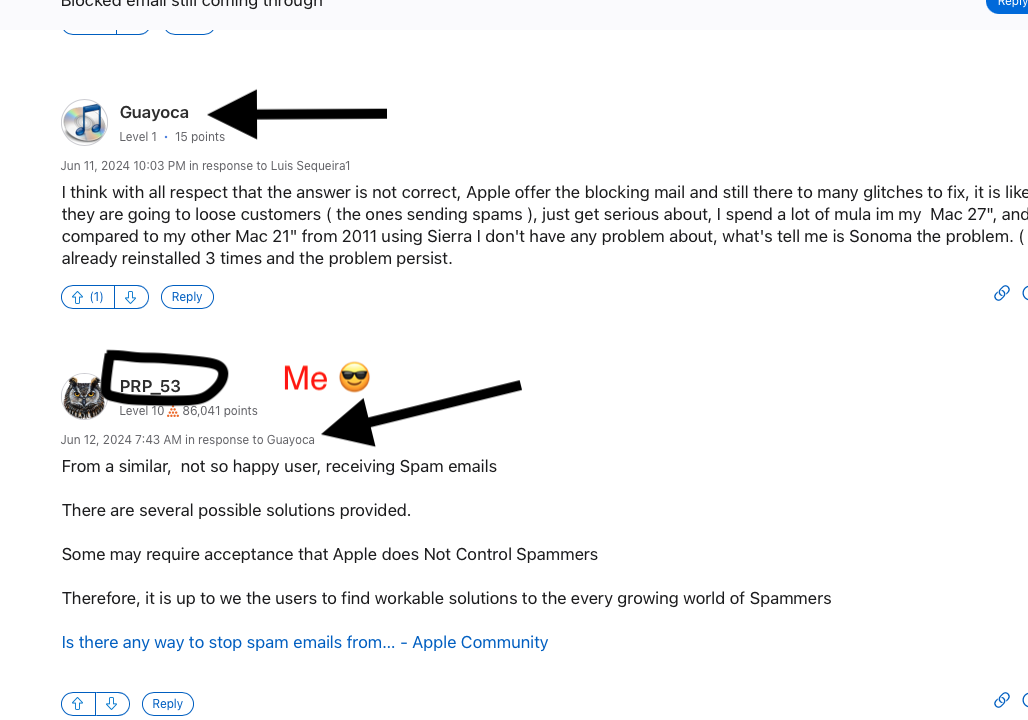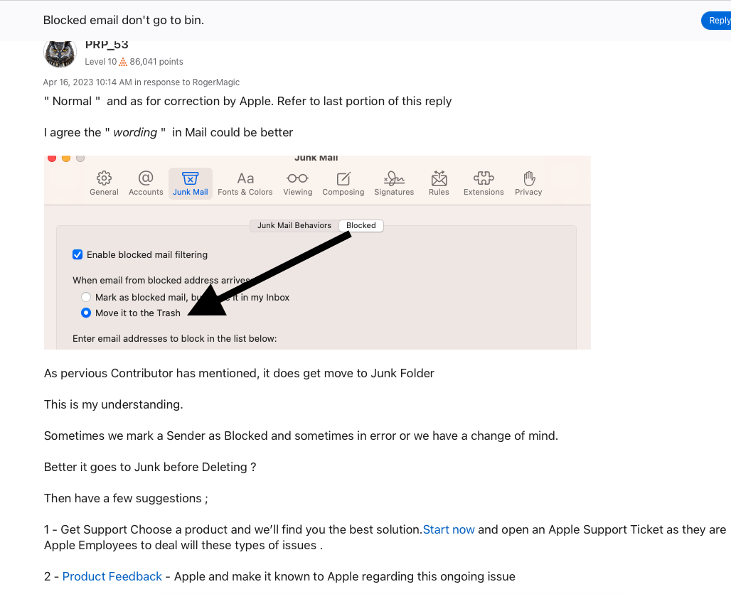 So no, Apple is not responsible for keeping Spam out of our inboxes. But they provide tools in Mail to help us with this problem. And we're trying to find out why the tool for sending blocked addresses directly to Junk Mail isn't working.
