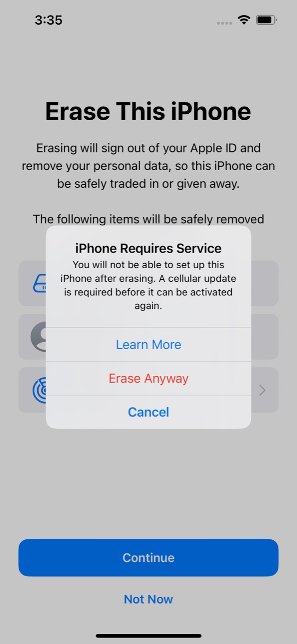 (You will not be able to set up this iPhone after erasing it. A cellular update is required before it can be activated again.)