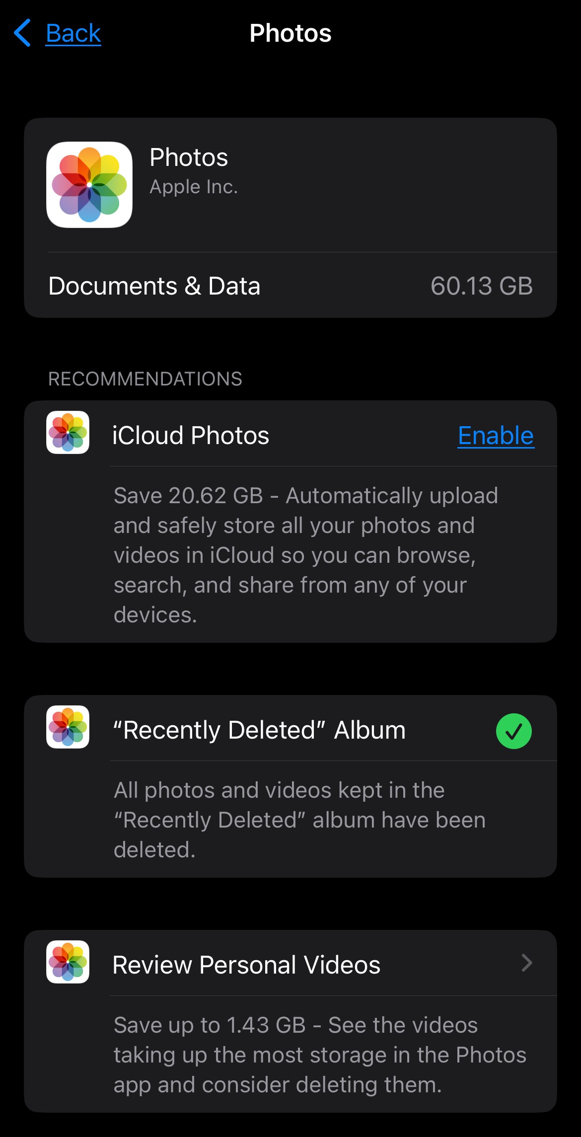 My Photos app was taking up about 30GB of space before I recorded some videos. After recording, that number jumped up to 60GB. So I deleted those videos from the Photos app in order to free up space. However, despite permanently deleting the videos from the "Recently Deleted" section, the number still remains at 60GB.