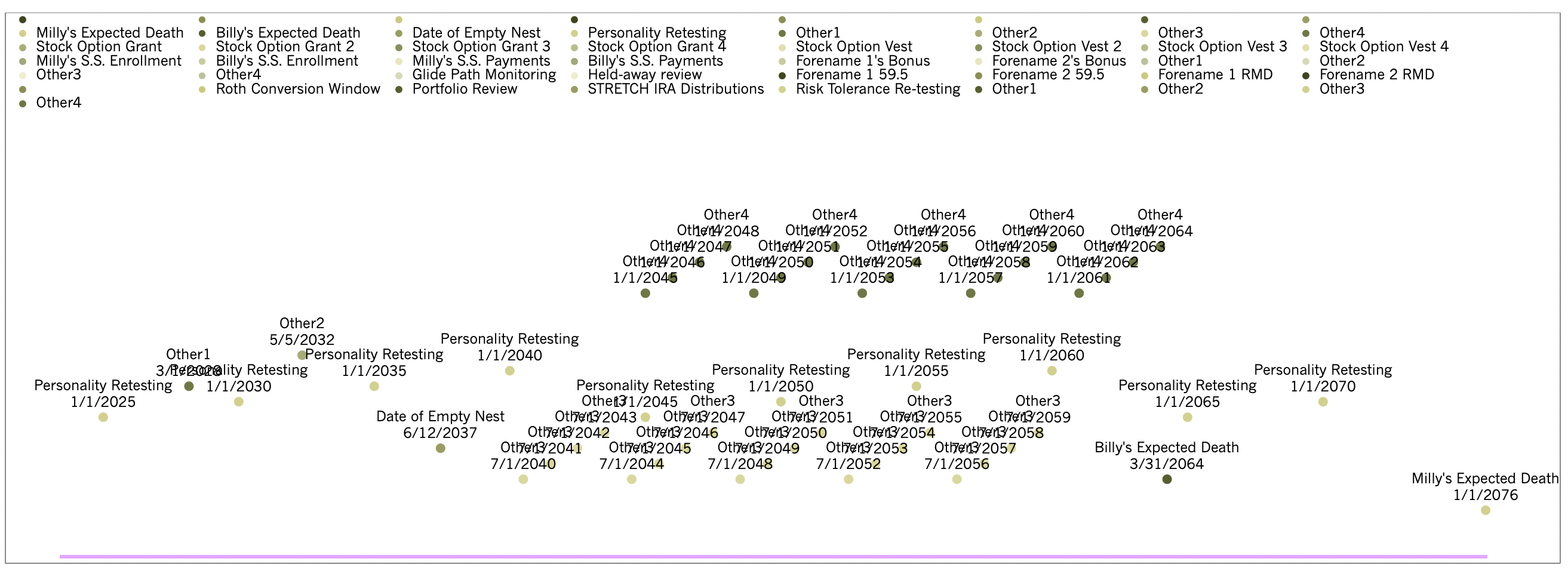 Here is the chart, a 2d scatter chart formatted to look like a timeline.
