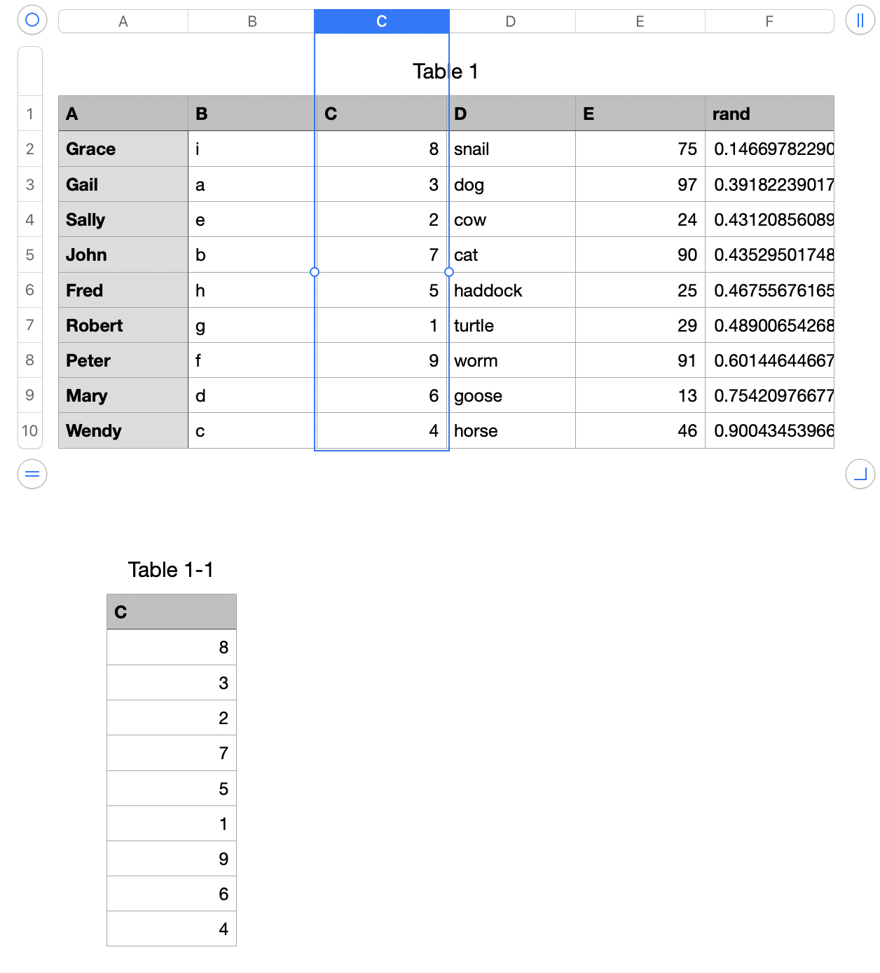 Click on the first data cell in the column to be sorted (C) in the original table, then press command-V to Paste the sorted data into that column, replacing the previous (unsorted) list.