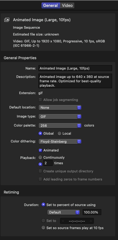 I'm sending a 1080p h264 FCPX project to Compressor where I apply an Animated Image preset to output gif, max 1080p at 10fps. The colour preset is the default Floyd-steinberg global 256 colours dithering.
