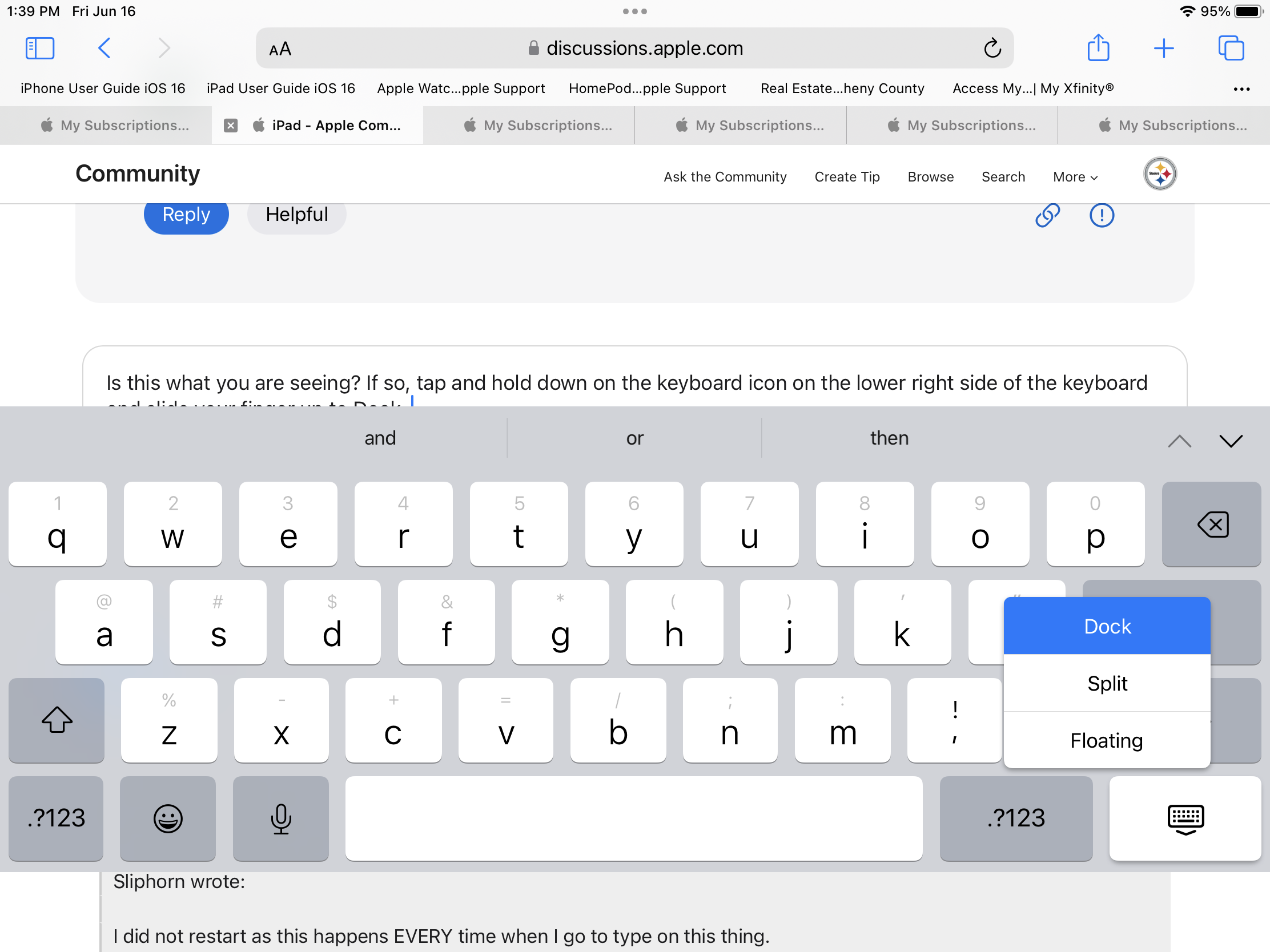 If the Split Keyboard is restored instead of the full on-screen keyboard, you can either use two fingers (one on each of the two half-keyboards) and swipe the two halves together - or touch-and-hold the “keyboard” key, then slide your finger to the Merge & Dock option and release.
