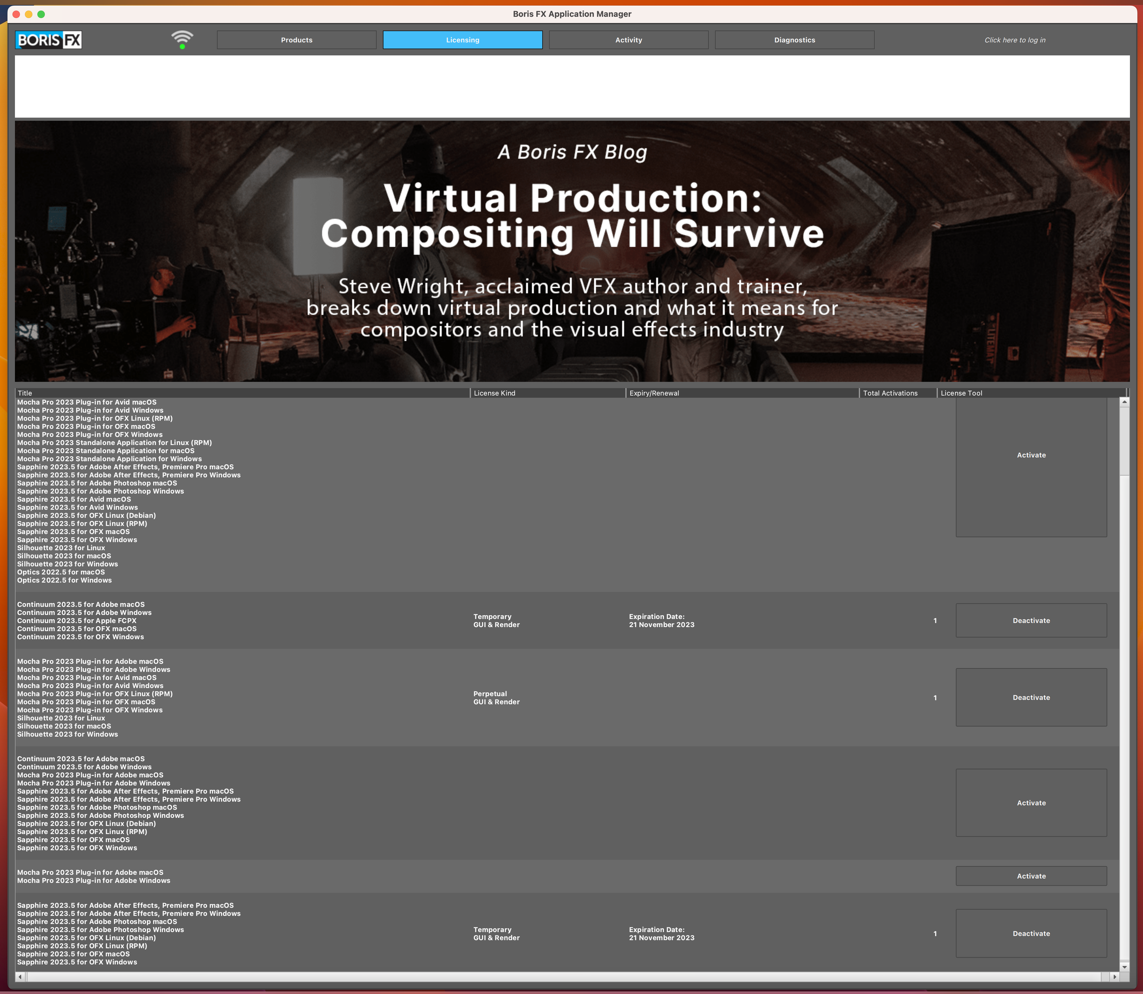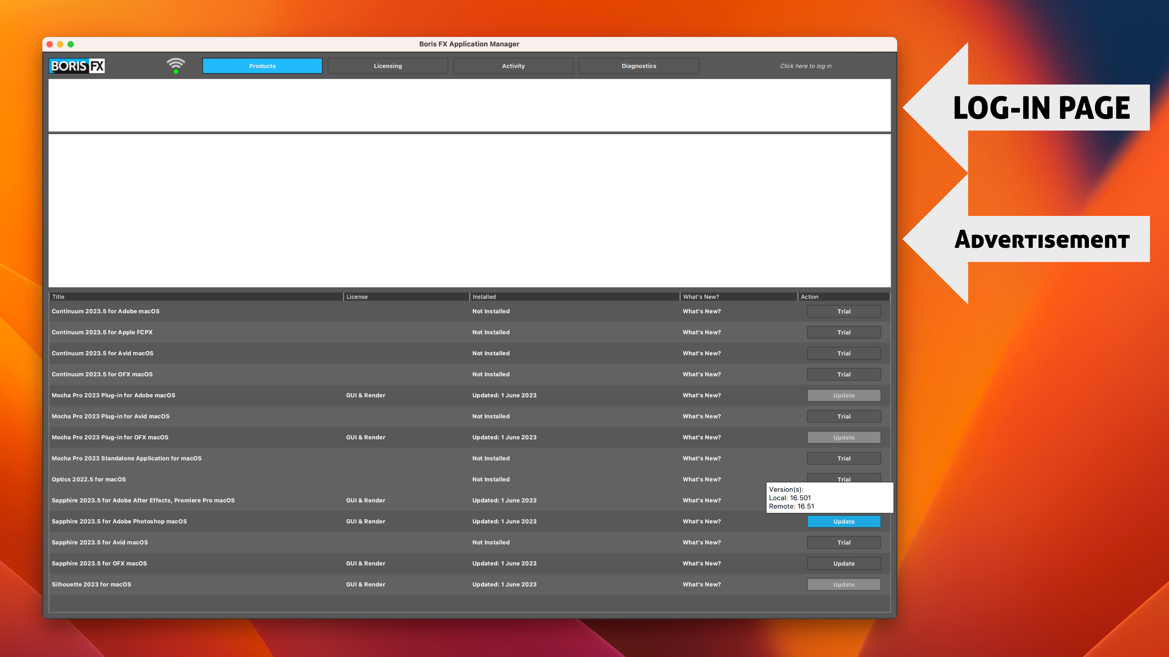 showed like above, the Log-in area is white blank and BorisFX Ad area is also blank. I can see the Ad if I click any tab except Products Tab.