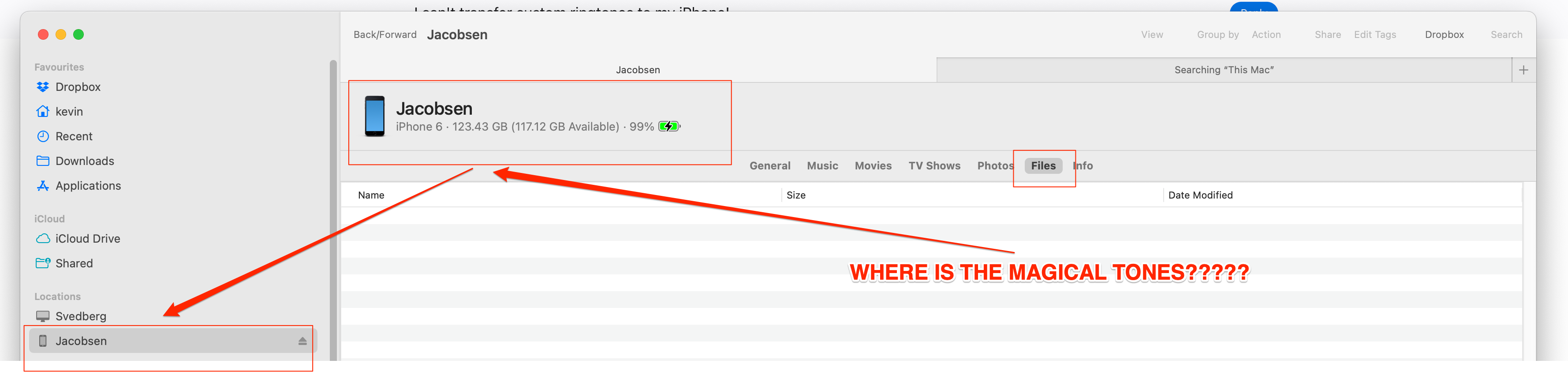 6. Now, simply drag and drop your .m4r custom ringtone files into the Finder window under the "Tones" section.