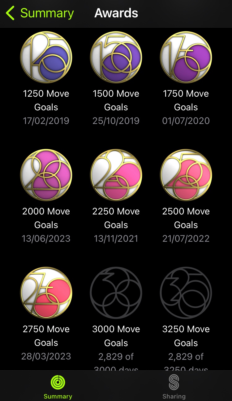old phone has missing data but with errors like 2000 days achievement shows June 13 of 2023 whereas it was reached long time ago and the date is way later than the next achievement of 2250 which was reached on November 11 of 2021. And longest move streak indicates that earned days are 2001 days ending on 14/06/2023 and my current streak is 2640 days.