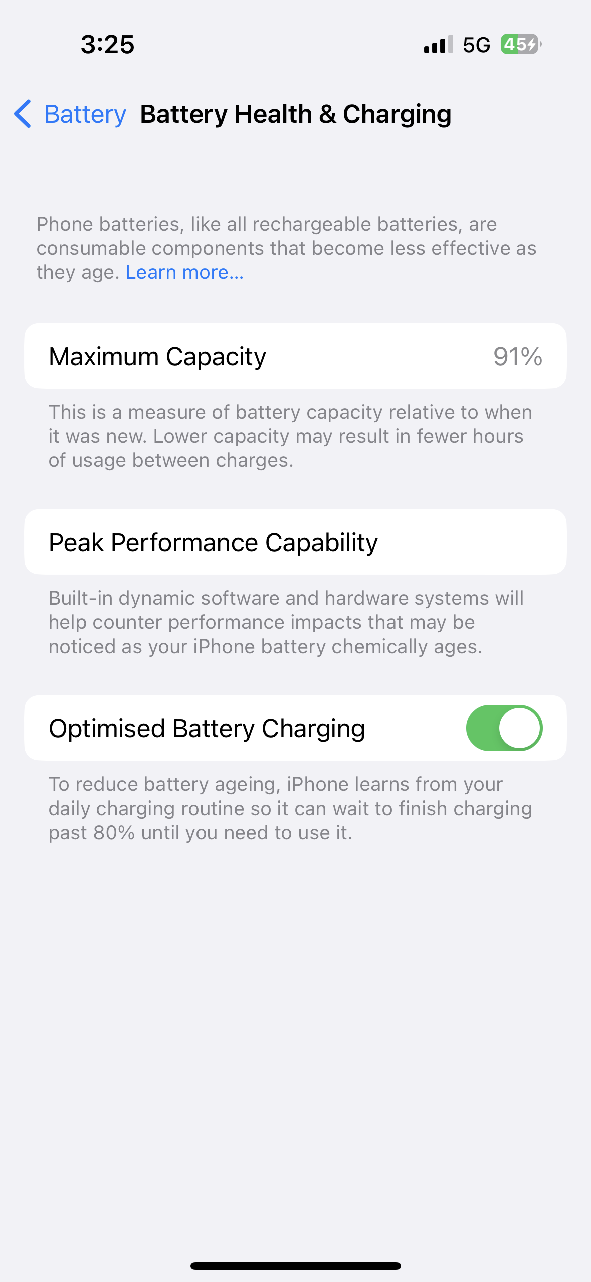 Once the capacity drops below 80%, or if there is a message in Battery Health that the battery is not meeting peak performance expectations, it’s time to change the battery→iPhone Battery Replacement - Official Apple Support