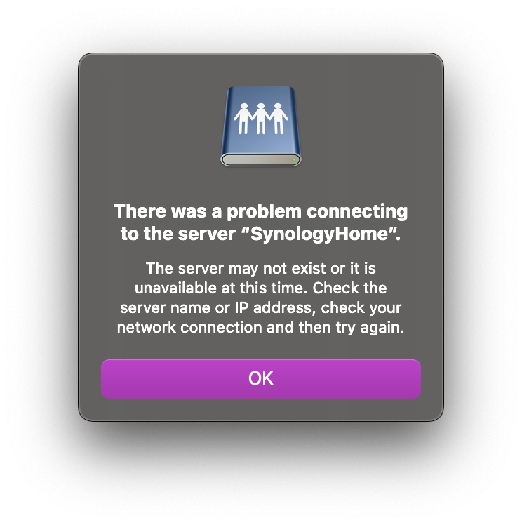 In 'managing' the Synology accounts on the NAS, I changed the password for the main account which, understandably, led to connection issues between the Mac and the NAS, so I changed the credentials on my