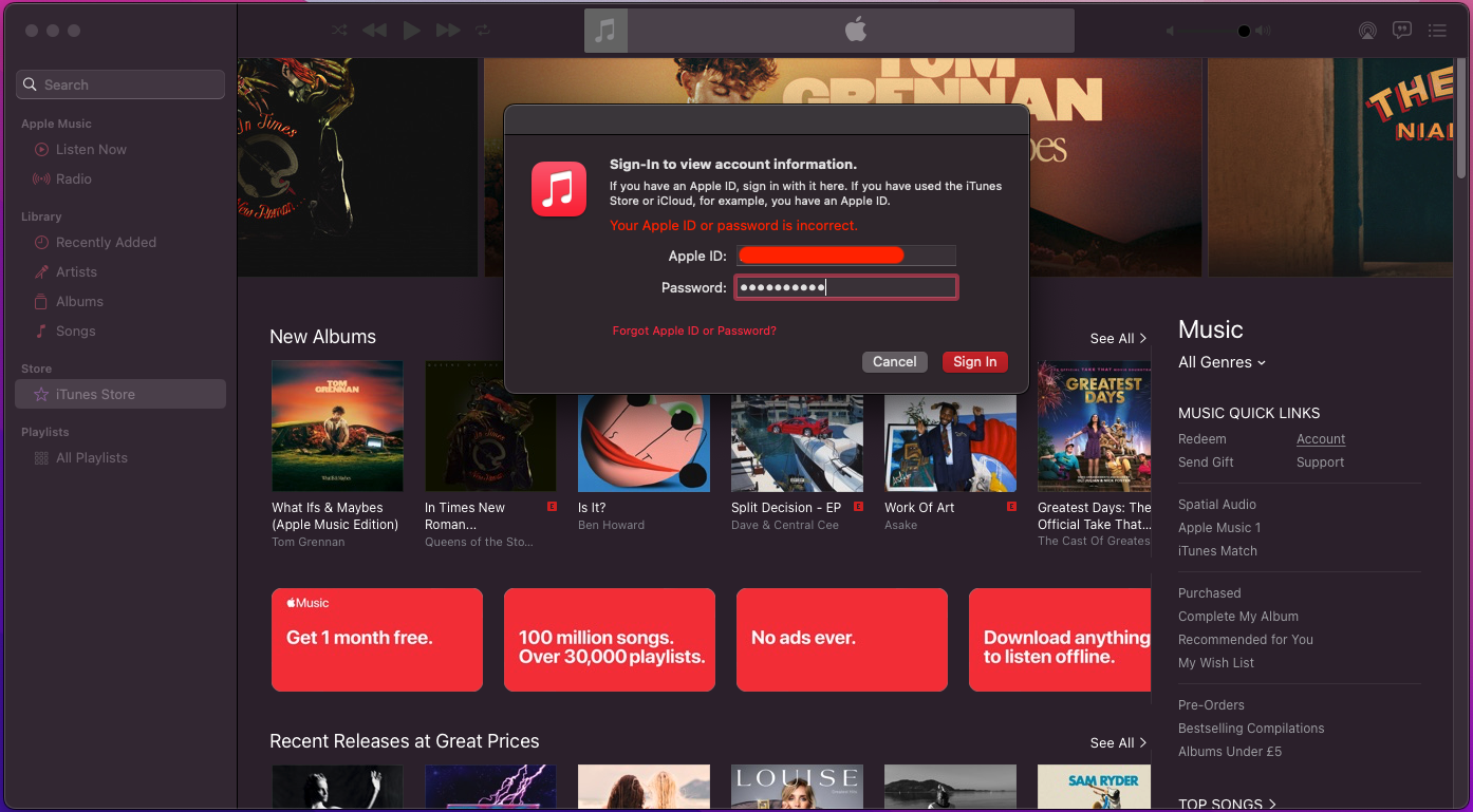 I add my Apple ID (as a test I put in the wrong password to confirm that it is correctly looking up my credentials):