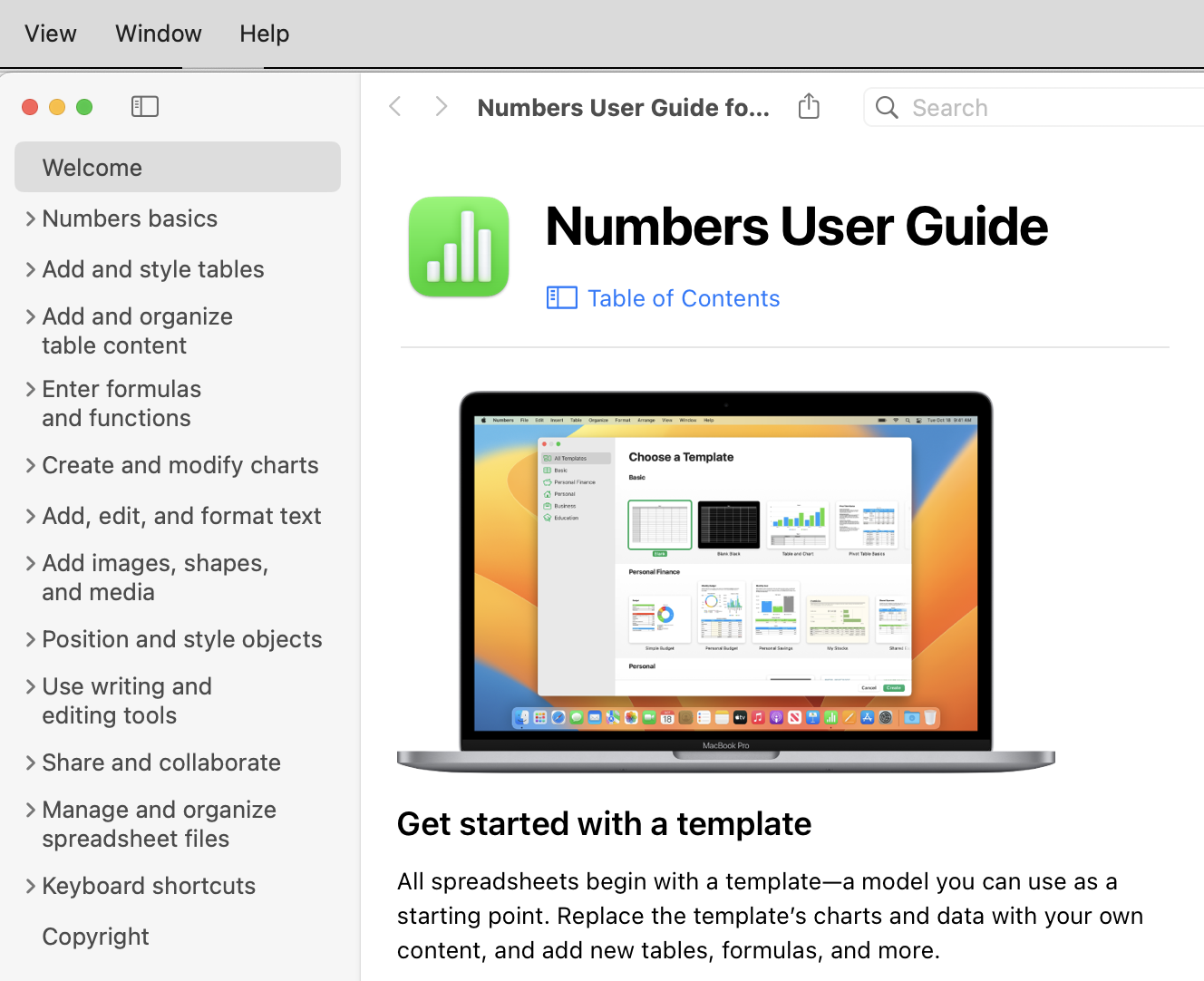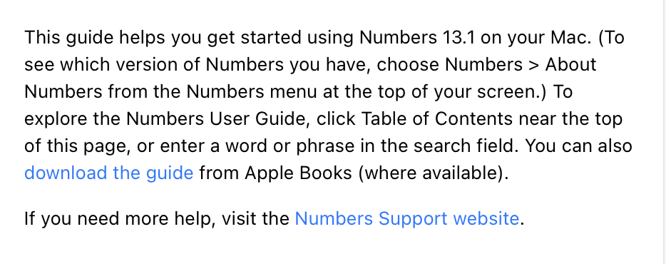 Click the Table of Contents link under Numbers User Guide to open a more complete TOC with access to the entire guide. At the bottom of this page you will see a link to download the guide to your Mac, where you'll be able to consult it without the steps listed above.