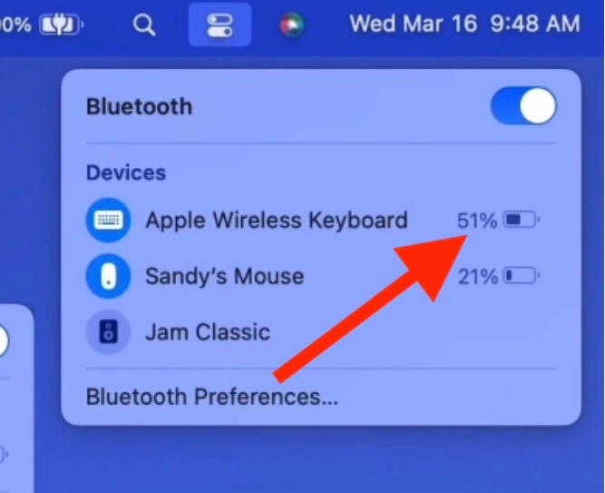 The Bluetooth panel in System Preferences/Settings has an option to keep the Bluetooth icon on your menu extras panel. Then a click on that symbol reveals your paired Apple devices and their current charge percentage.