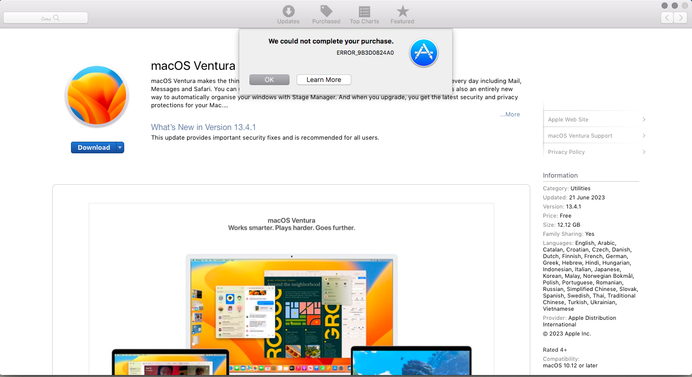 Now I'm trying to install macOS Ventura form AppStore but there is an Error code shows: