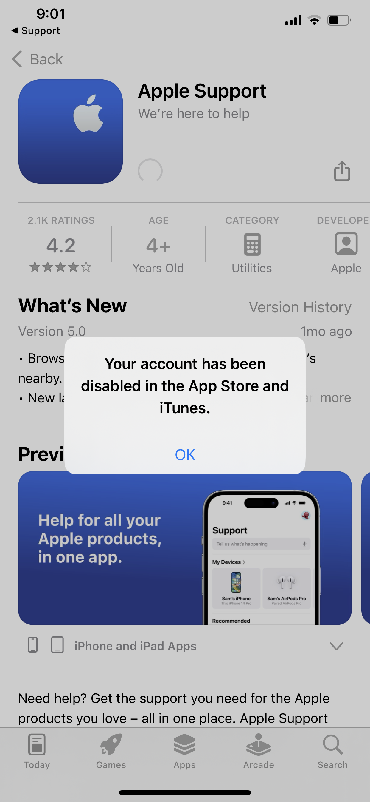 If you see a message that says "Your account has been disabled in the App Store and iTunes", there is a problem with your payment method on your account, to resolve the problem you need help from Apple support, click -> contact Apple Support for help.