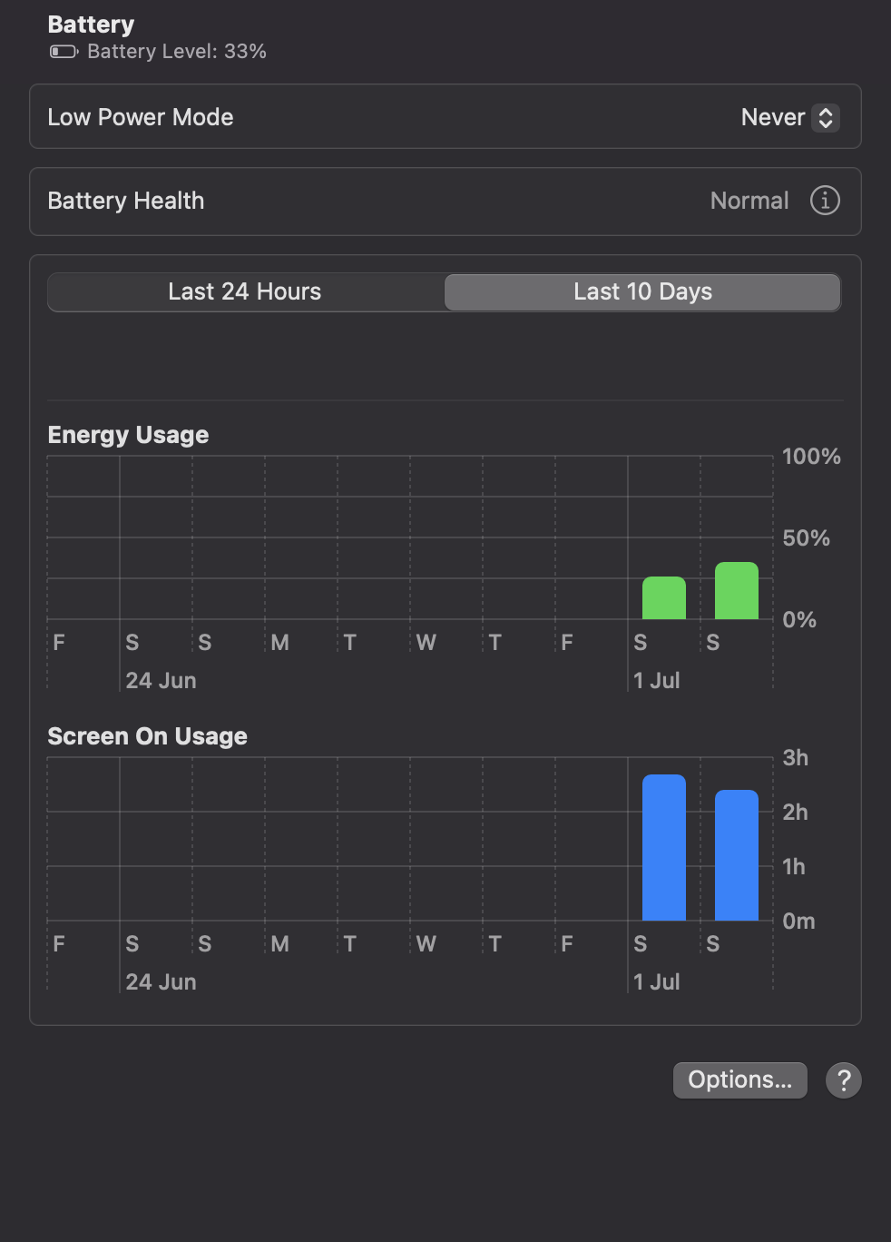I just bought my the latest MacBook Pro M2 Pro 14-inch, 2023. I have been browsing the laptop and using it for browsing the internet, but my battery is now at 30% though I only used it for 5 hours. Please find the screen capture of my activity. Can you share with me if this is normal? I have another Pro M1 13-inch, 2021 but I feel like that one lasted longer though I have been using it for two years.