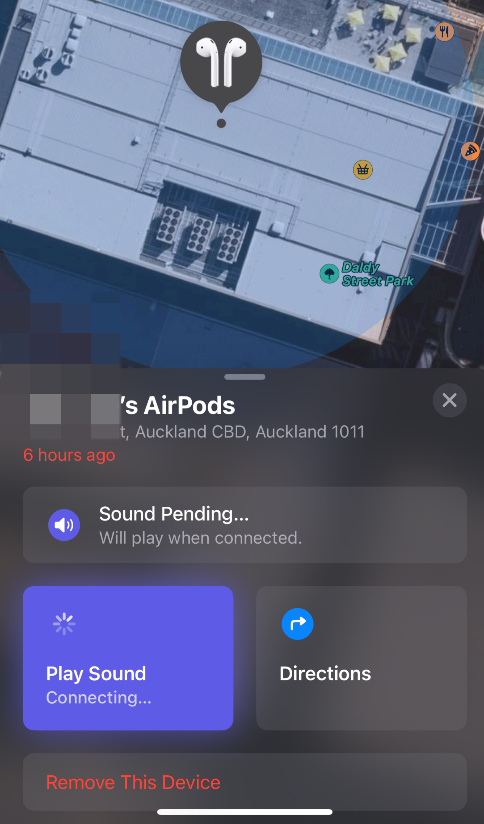 When I open the Find My (/Devices) app (on any Apple product) and tap on AirPods/Play Sound, I get a message of "Connecting", followed by one that says "Sound Pending: Will play when connected."