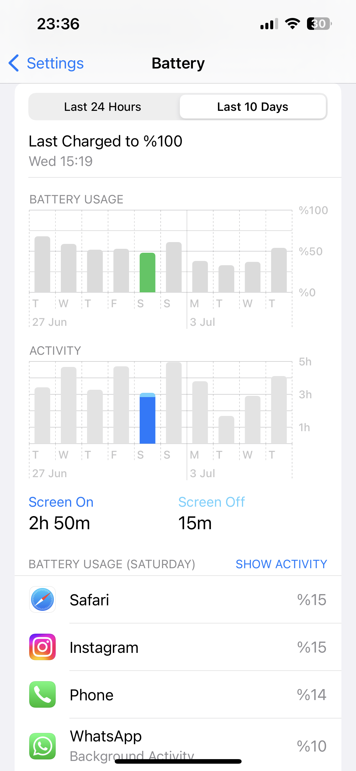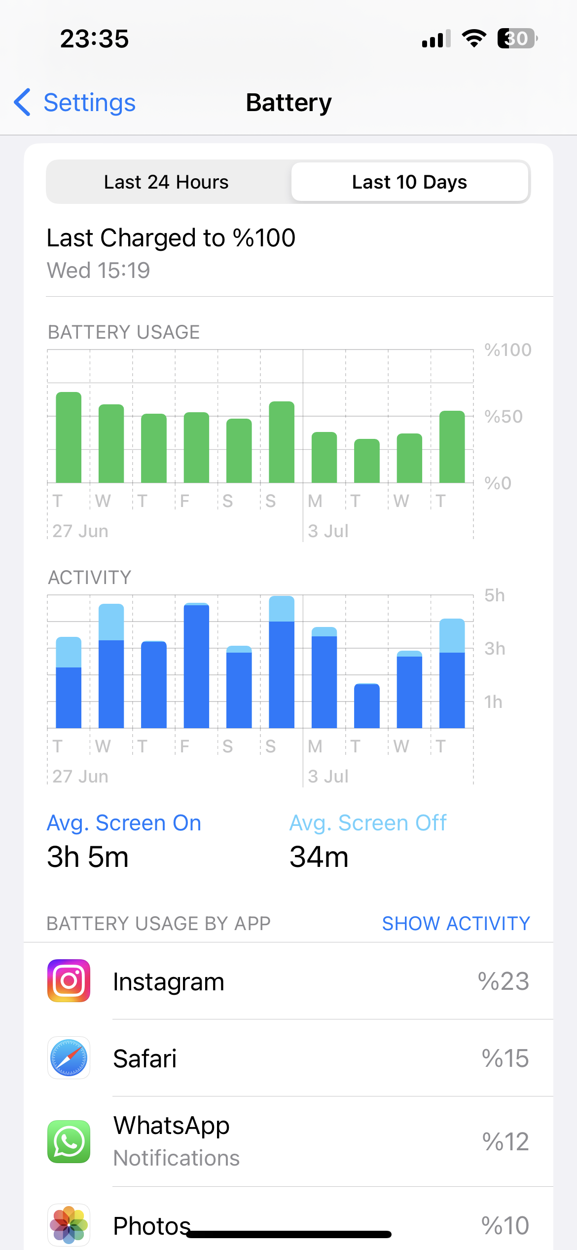 I am using Iphone 13, battery health is 100% and telephone is 2 months old. My iPhone consumes 50% of battery in general within ~2h 50m of screen on and 15 minutes of screen off usage. However my friend's iPhone 13 consumes 55% of battery within ~6 hours of screen on and ~3 hours of screen off usage and his iPhone is 1 year old with 90% battery health.