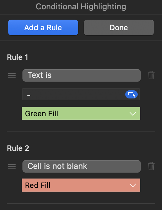 - If the cell contains a single "dash", i.e. the single character "-", it will be highlighted green
