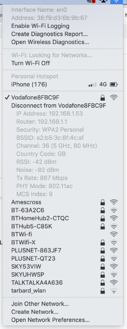 We have recently upgraded from a Vodafone superfast 2 router and booster to a Vodafone Fibre 1 router and booster with VOIP. My wife uses a MacBook Pro (2017 – 2020) positioned in the same room as the router and the booster is at the other end of the house. It has always connected to the internet fine no issues. However when we switched to the new vodafone service and turned on the new booster, the mac keeps dropping the connection every 2-3 minutes. You then have to reselect the network and connect from the apple menu. This issue does not happen on any other devices in the house including iphones and ipads. The issue dissapears as soon as you turn off the vodafone booster. However I rely on this booster for my work at the other end of hte house. Any ideas? Anything we can try on the mac settings? Vodafone useless, BT confirmed no fault on line.