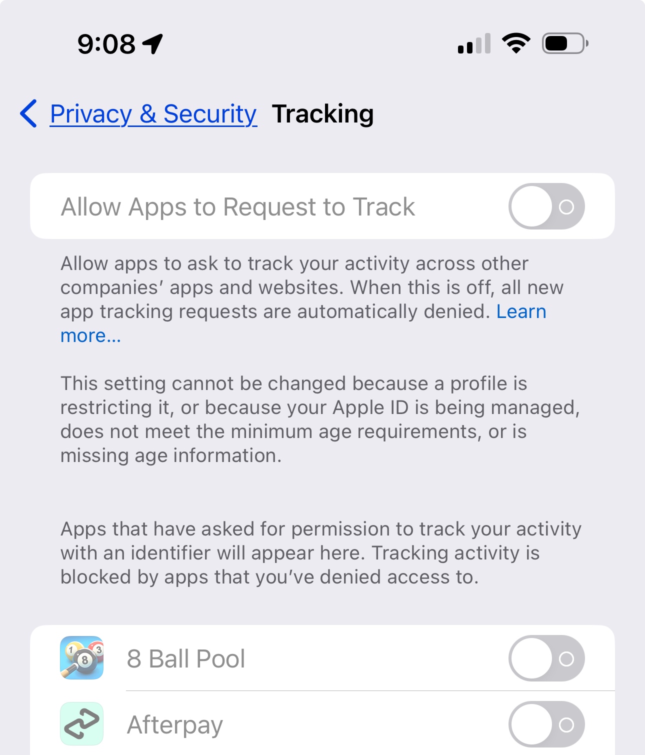 In some circumstances, the "Allow Apps to Request to Track" setting can't be turned on, including: