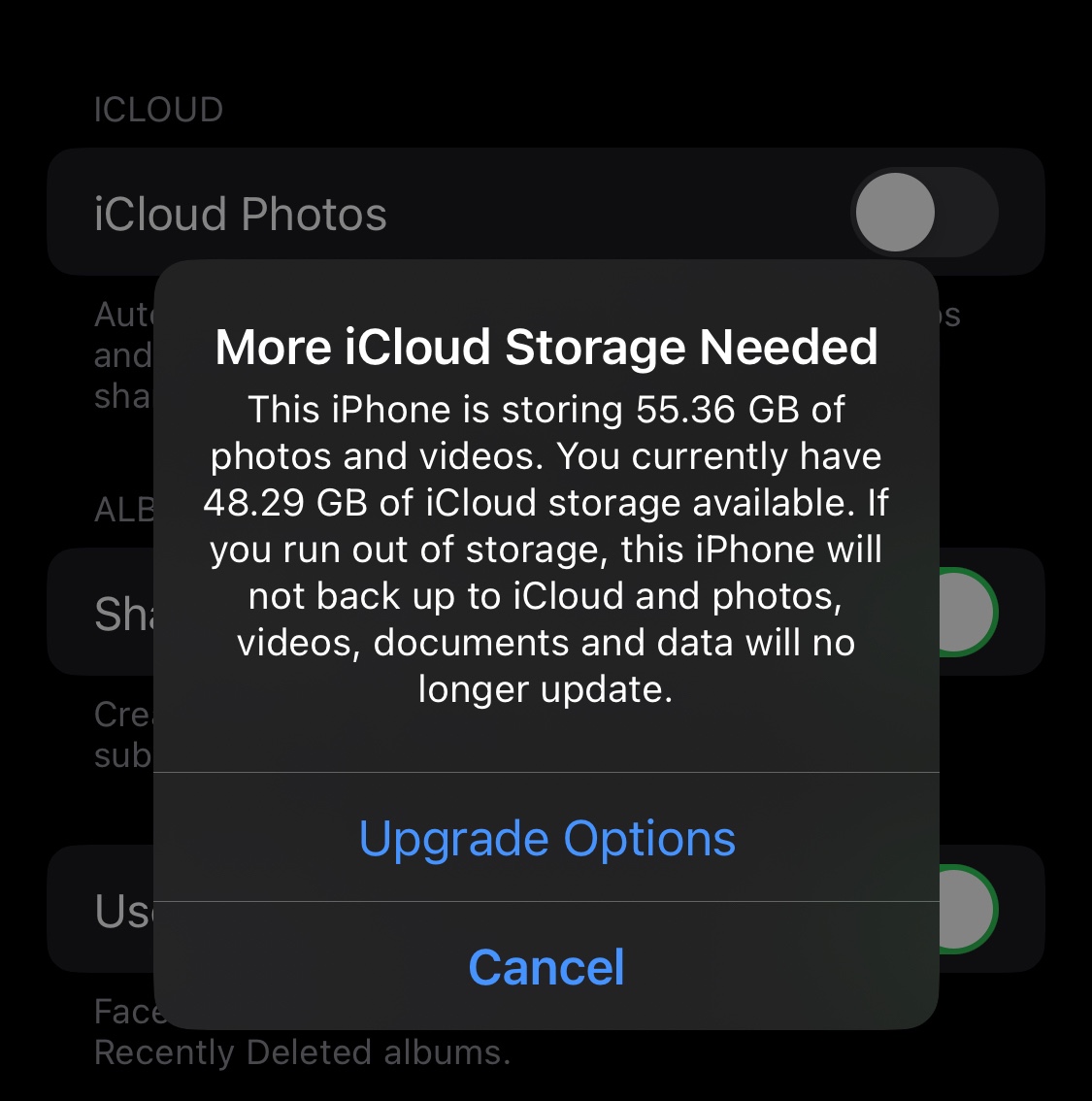 Got iCloud+ so I could upload more photos. It won’t even let me turn it on for photos because it has too much data, despite having almost 50gb free in iCloud+.