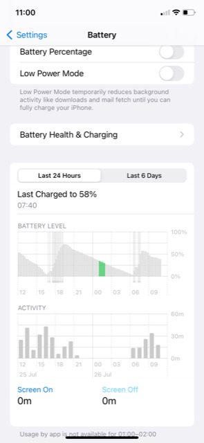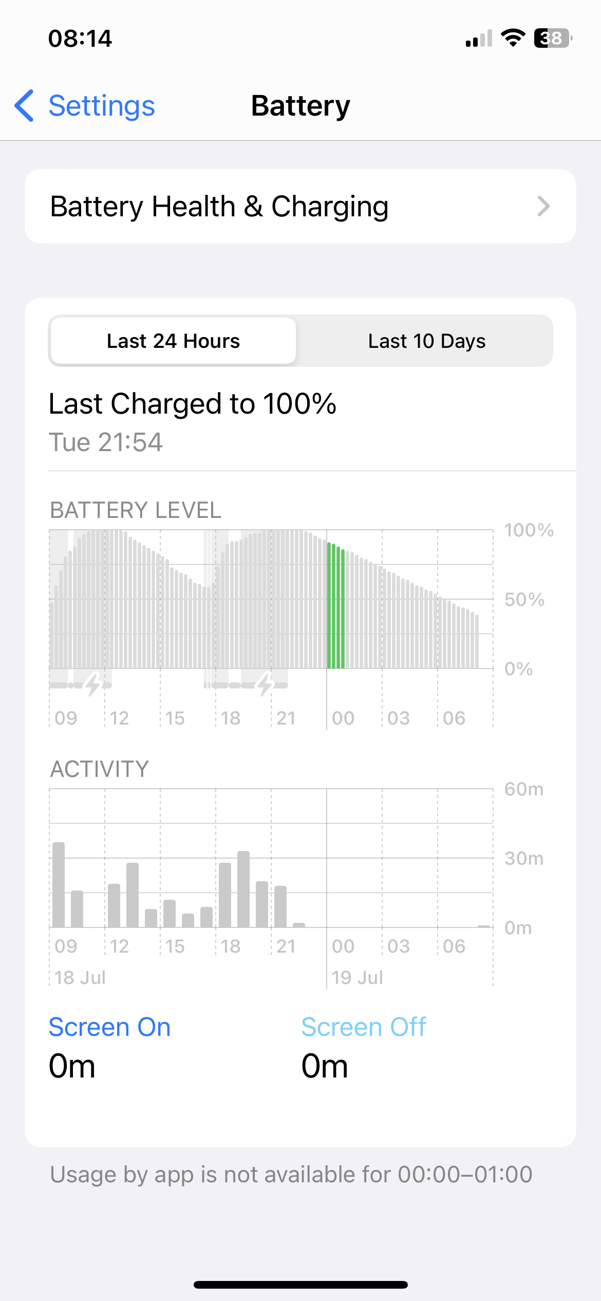 10.30 pm was 100%. 8.30am 38%. WiFi, Bluetooth, location, background app refresh all off