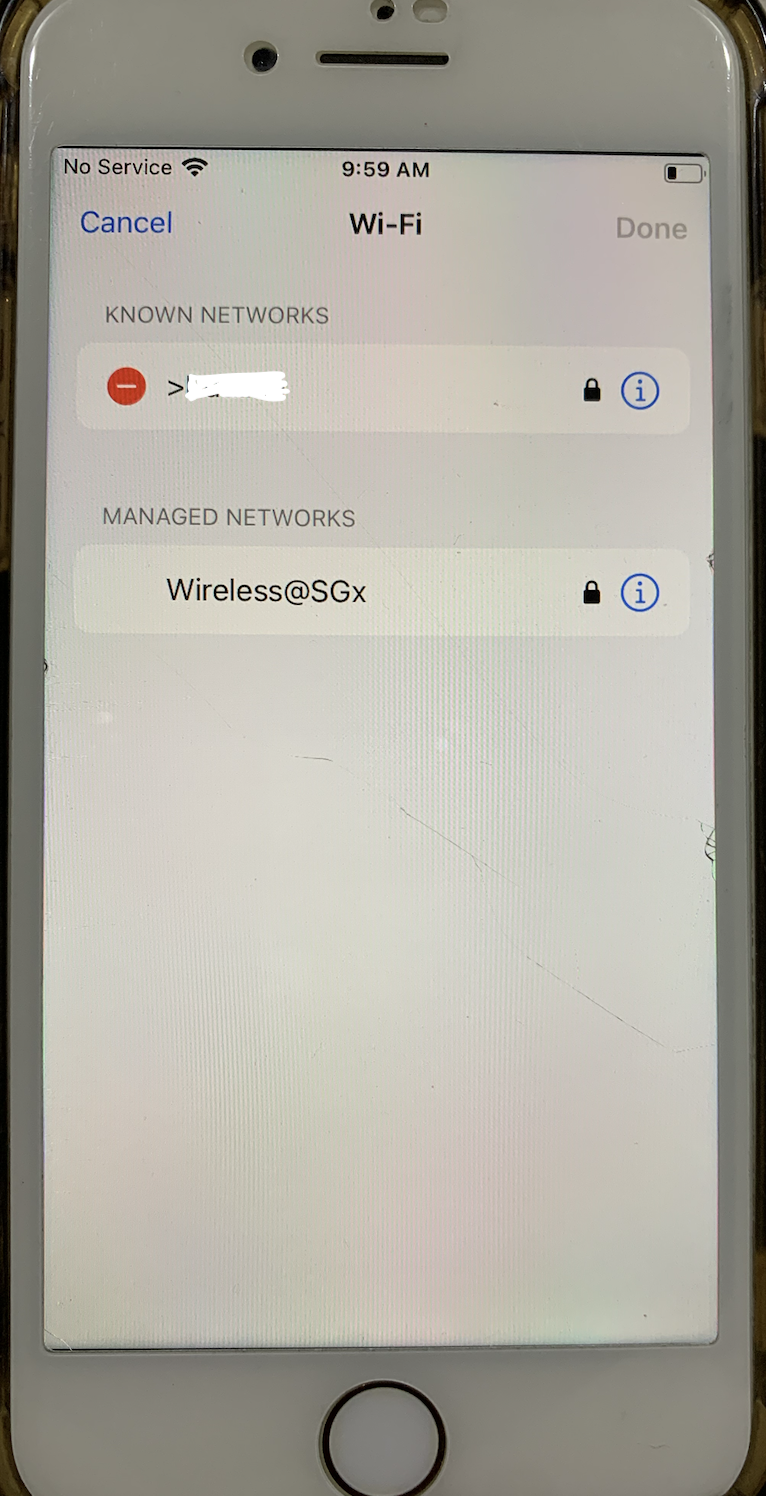 3.Go to Setting > Wi-Fi > click "Edit" > go to "Managed Networks" > click on " i " icon that is beside the public wifi configuration profile > check for removal or delete button ? || -> there isn't any removal or delete button at all.