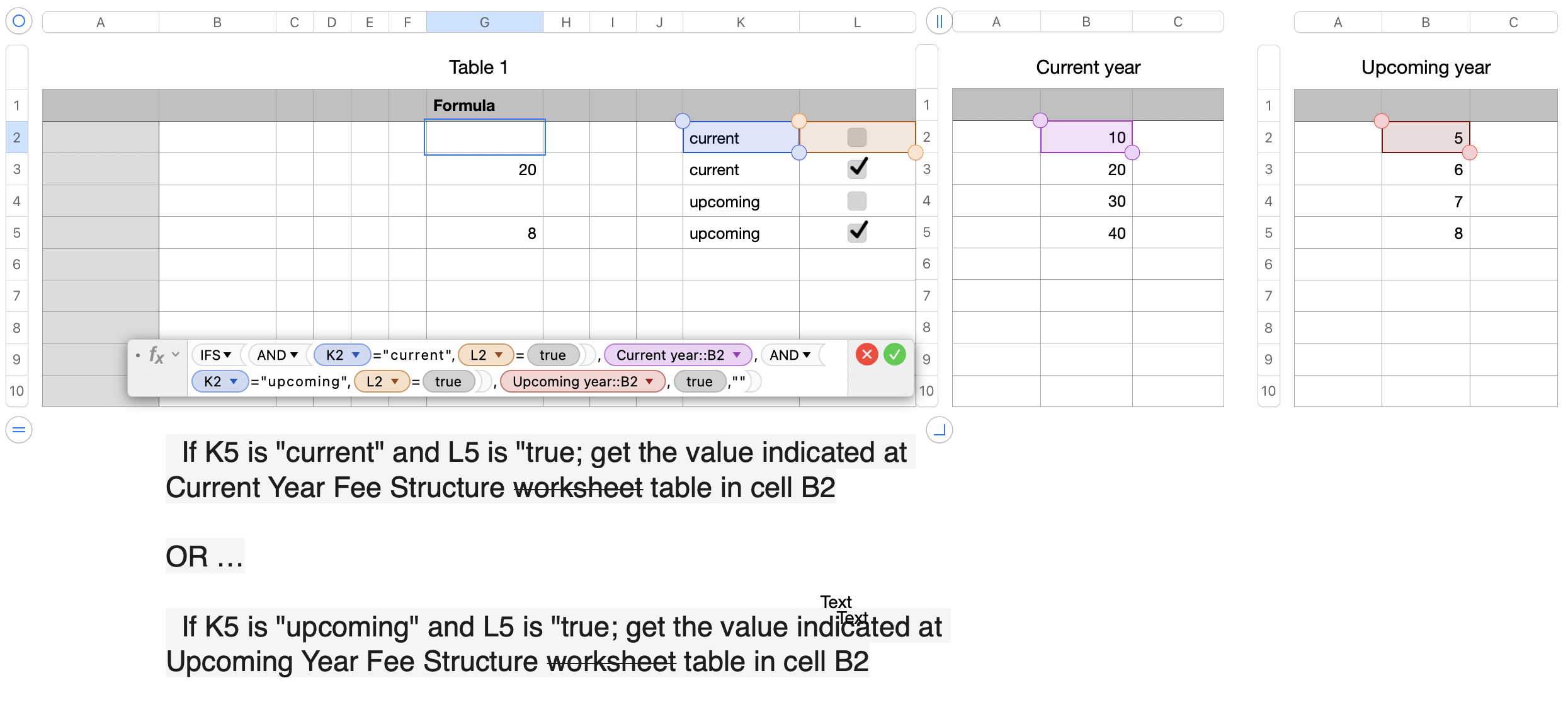 If K5 is "upcoming" and L5 is "true; get the value indicated at Upcoming Year Fee Structure worksheet in cell B2