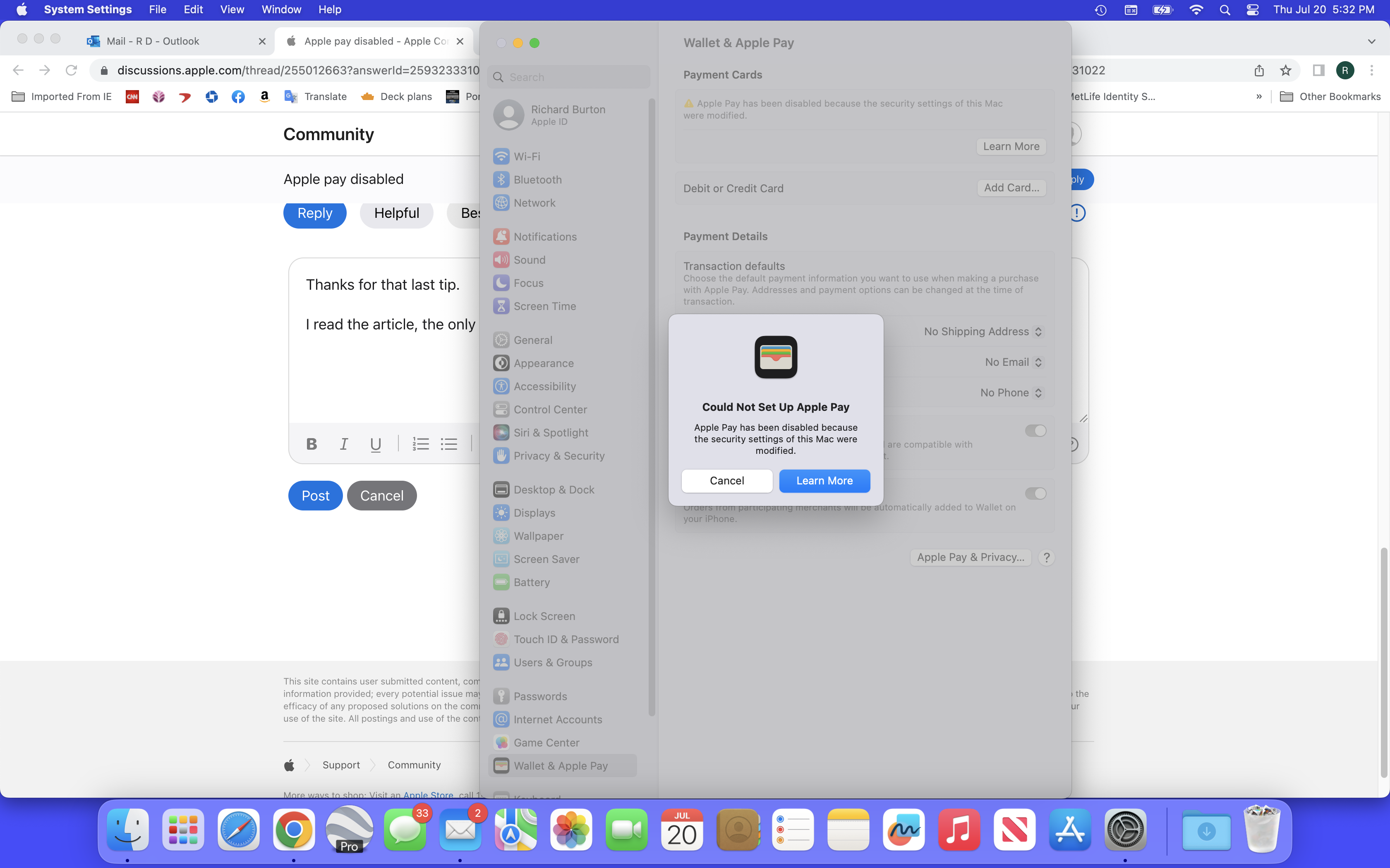 Running 13.4.1(c), so fully up to date. Followed instructions to set "startup security" to highest level using startup utilities (it was set lower). Still getting Apple pay disabled message.