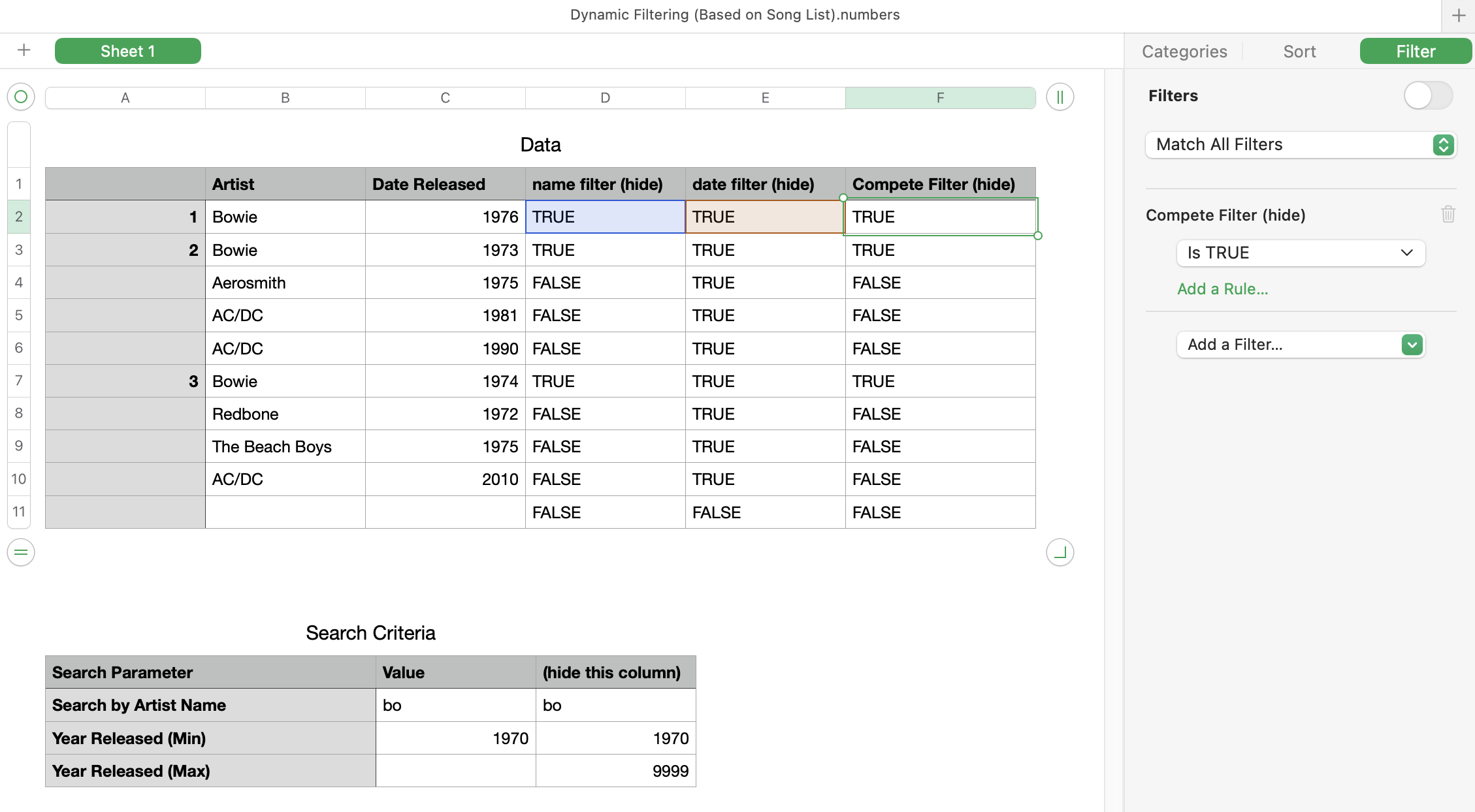 However, you can make numerous filters (or "dynamic" filters) with a few columns and a single actual filter. Below is an example put together for someone who wanted to filter their table of music. You enter the filtering criteria into a small table. The main table has extra columns containing formulas that determine which rows meet each criteria. One final column puts it all together and you put a single "if true" filter on that column.