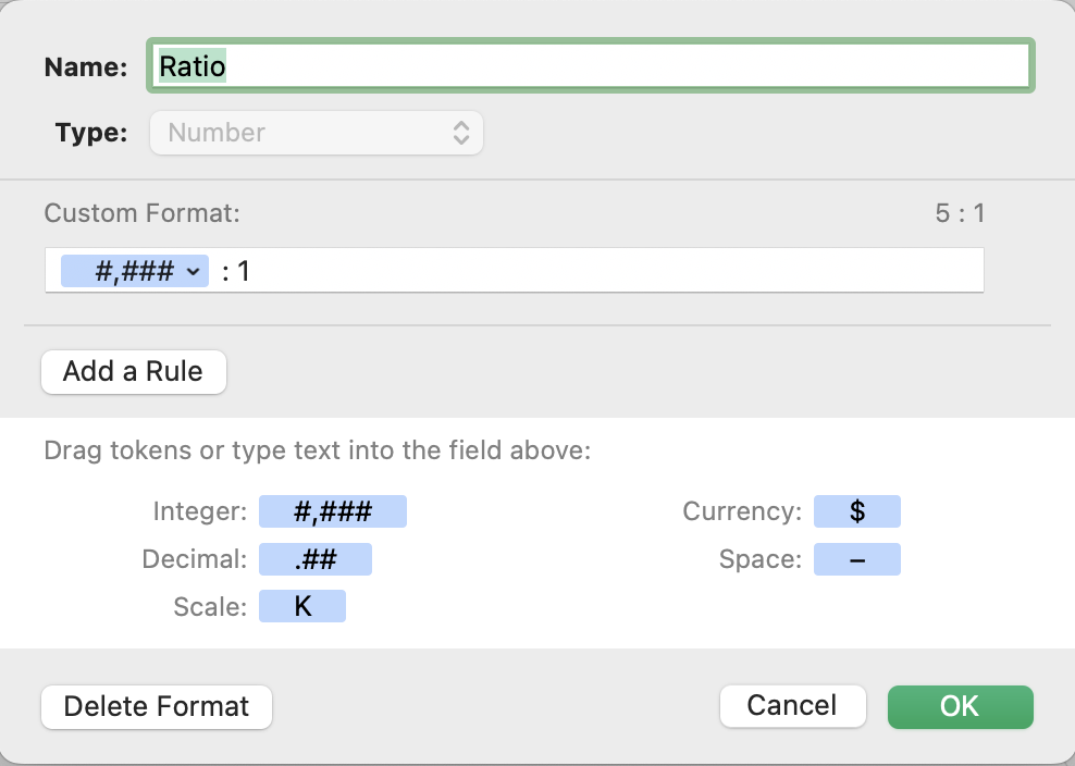 So another way to do it if you like the 5:1 kind of format is to create a custom format. The formula will be a simple numeric formula of =I5/J5 . The custom format will look like this: