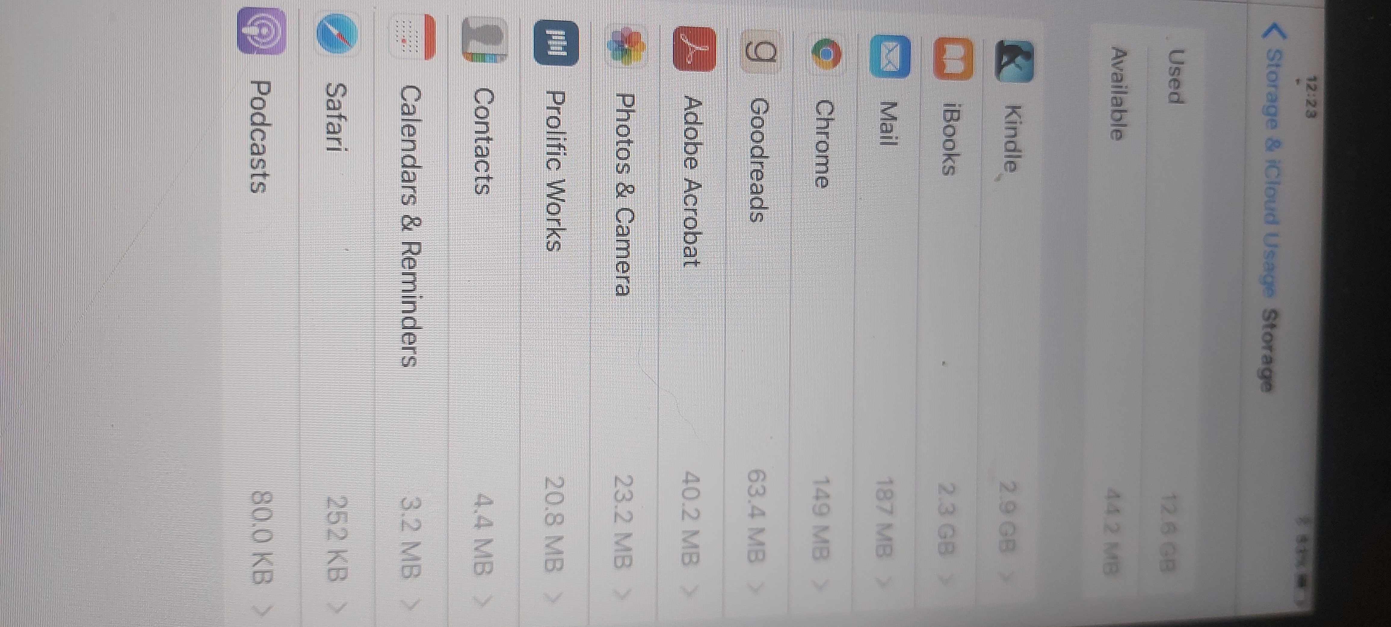 I have alot of books on the ipad on both kindle app ( 2.9gb) and ibooks (2.3 gb) Together 5.2mb. The other apps when I look in storage, have storage of roughly 400mb. It says I have a total of 13gb of storage with 12.6gb used. Even if I delete books on kindke app, the 2.9 gb does not go down. Everything I open it up the storage available will change now saying 44.2mb available. Earlier this morning it said I had 100mb available, two days ago over 300mb free.