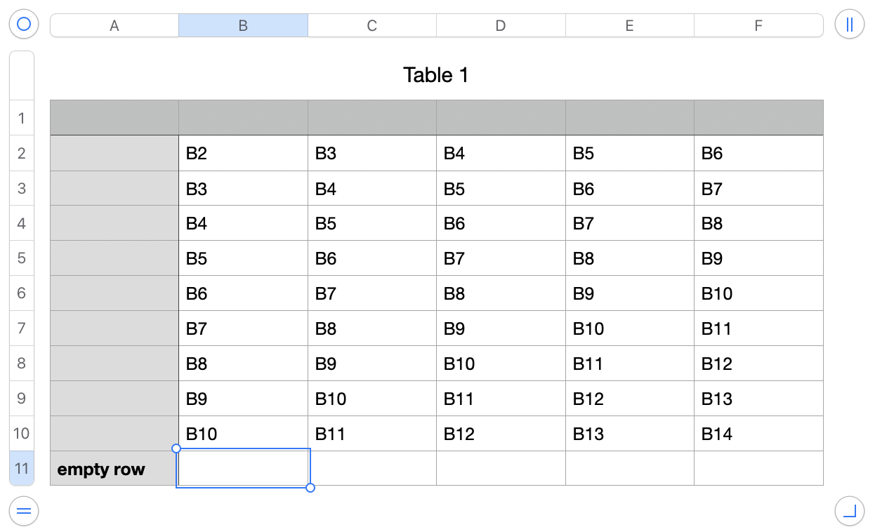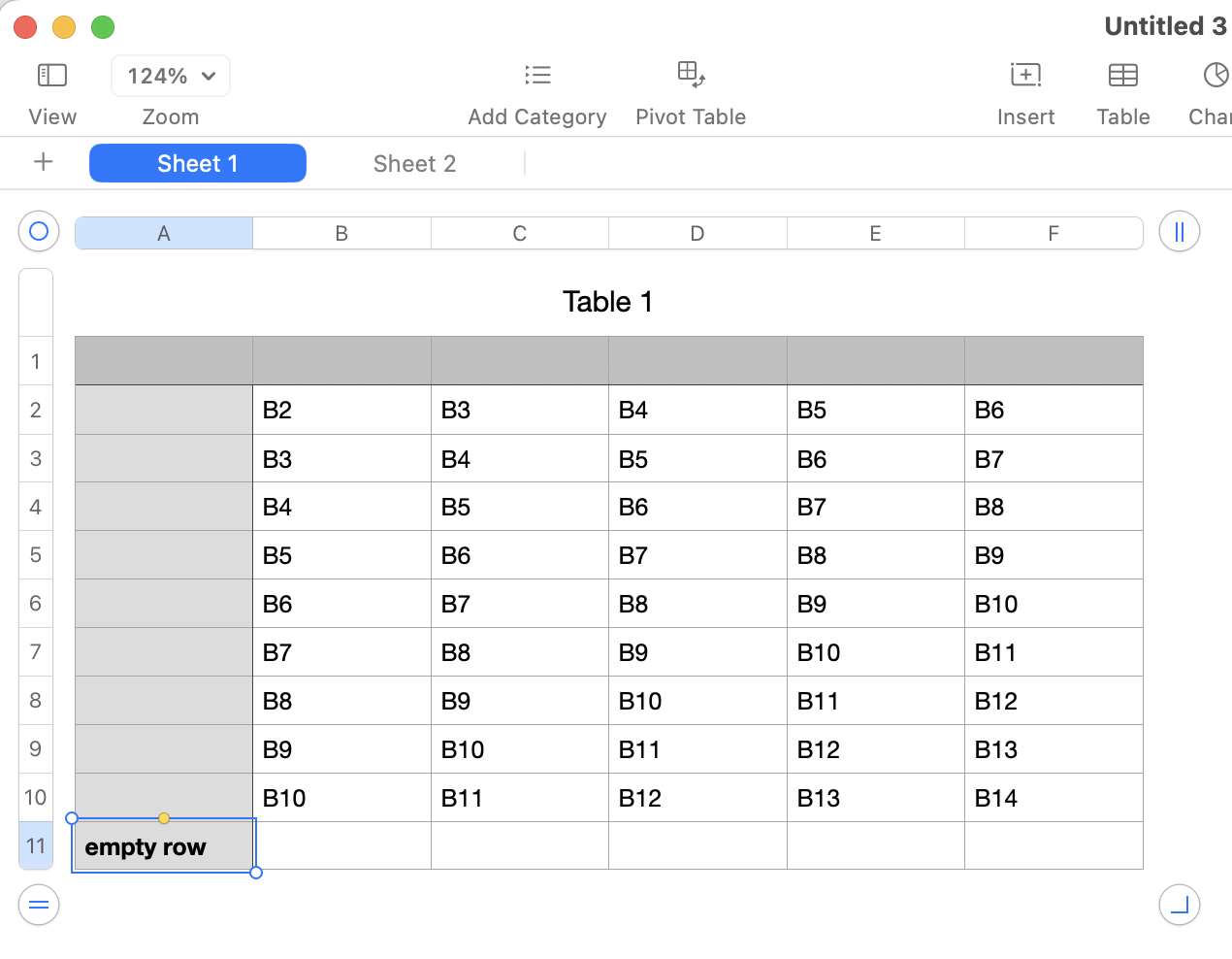 Table 1 on Sheet 1 has a Header row, a Header Column, 45 cells containing data, and an empty row, added to give a starting place (cell B11) for adding more data.